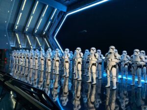 The newest ride is Rise of the Resistance and I can assure you there is absolutely nothing like it in the world! It is an incredible experience that will leave you speechless from before the ride even begins! The queue starts with you heading into the caves of the Resistance’s newest base on Batuu, you’ll head deeper in until you arrive at the armory which is where the Resistance keeps all its weapons, and flight suits. Once you’re through the armory you’ll be taken in groups for briefing. In the briefing room you’ll encounter BB-8 and a few other familiar faces who urge you to join the Resistance in fighting the First Order. You’ll receive your mission briefing and then head outside to your transport shuttle. [TIP: Make sure you look to you right before heading onto the transport] Take a look around and then hold on because you’ll be heading into space! Things take a turn for the worst when you transport gets intercepted by a First Order Star Destroyer! General Hux warns that your transport is about to be boarded. When he doors open you are inside the Star Destroyer and have a whole army of Storm Troopers with their blasters aimed right at you!