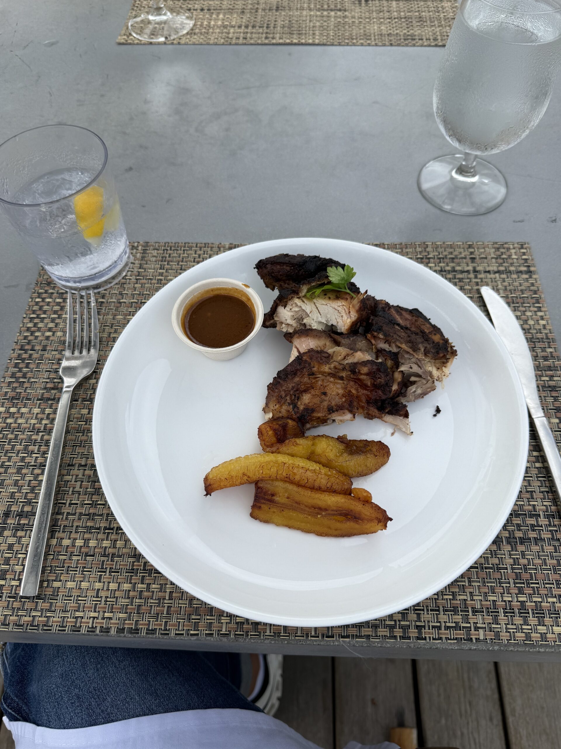 We touched down, checked in, and before unpacking a single bag, made a beeline for the Jerk Shack. This open-air spot serves authentic jerk chicken and pork, and it quickly became one of my favorite casual go-tos. The chicken was perfectly spiced, juicy, and served hot off the grill—exactly what you want after a long travel day. The menu is small, but they also have Jamaican patties, roasted sweet potatoes, bread and a few other items.