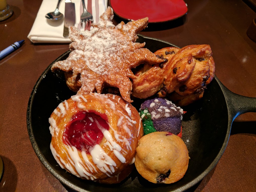 As soon as you’re seated, the table starts off with a plate of delectable and uniquely decorated pastries served in Rapunzel’s signature frying pan. Although there is only ever one of her signature sun symbol pastries, you can order as many refills as you care to enjoy! Possible family feud averted.
