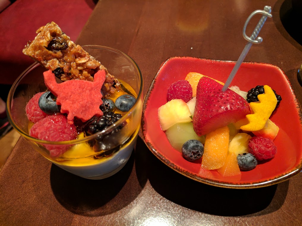 As a starter, you have your choice of either a Fruit or a Mixed Berry Parfait. The fruit bowl included special touches, like a sword spearing a piece of fruit and a small glitter crown cookie for a fun royal touch. The yogurt parfait had its own special flair with a crab shaped cookie to go with the fresh yogurt drizzled with honey, accompanied by fruit and cinnamon candied granola (I’ve seriously been dreaming of this yogurt parfait since this meal!).