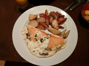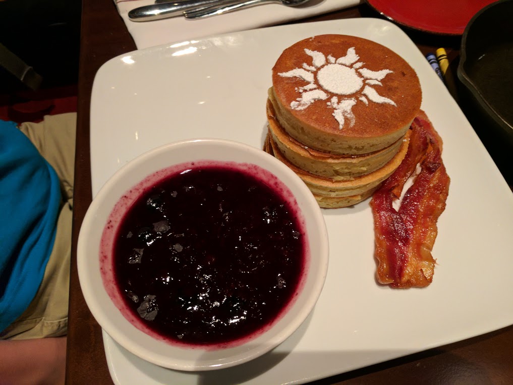 We had a hard time choosing but ended up with the Swimmer’s Delight, an egg white omelet with smoked salmon, goat cheese, spinach, mushroom, and tomato with roasted potatoes and a “Tower” of Pancakes for my 10 year old son. The pancakes were dusted on top of the tower with powdered sugar in the shape of Rapunzel’s sun symbol, another fun Disney touch to the meal.