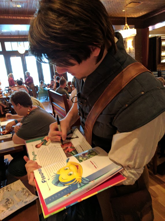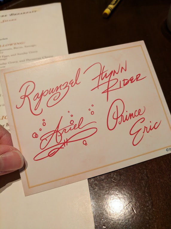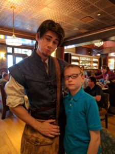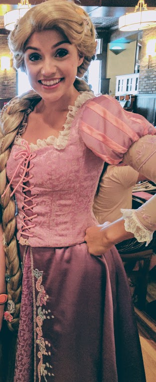 The mood in the restaurant is set by playing songs from the Little Mermaid and Tangled Soundtracks. The character interaction was the best I’ve had with face characters at Walt Disney World. Each character was announced into the dining room with a teaser description narrated over the music from that movie with much fanfare so you knew they were in the room and would be around to greet you soon. Since my 10 year old son was with me, meeting the two guys helped to make this not just a princess meet and greet. Flynn Rider taught my son how to do the signature smolder and Prince Eric looked very dapper (instead of the typical shipwreck outfit), while he asked my son about his boating adventures.