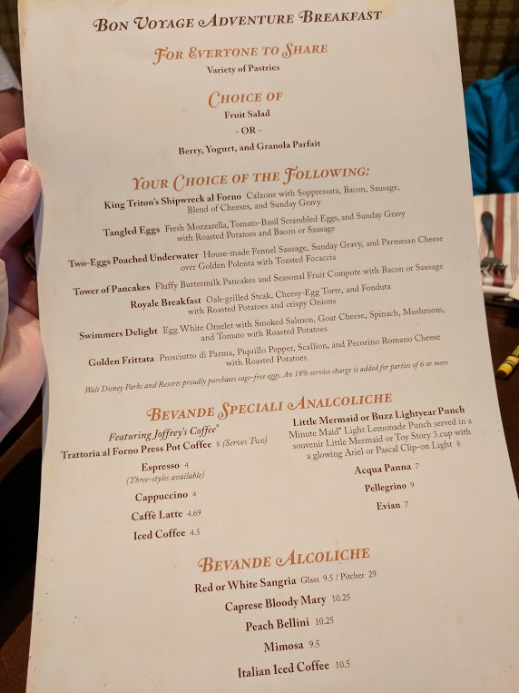 Adults can choose from seven entrées: the Golden Frittata, Tangled Eggs, Two Eggs Poached under Water, the Tower of Pancakes, the Royale Breakfast, and Swimmers Delight, and an Italian dish, King Triton’s Shipwreck al Forno, a nod to the lunch and dinner offerings served at Trattoria Al Forno typically. The children’s menu had typical breakfast fare with themed names like Flounder’s Flapjacks, Royal Breakfast (eggs and bacon) and of course a Mickey Waffle option.