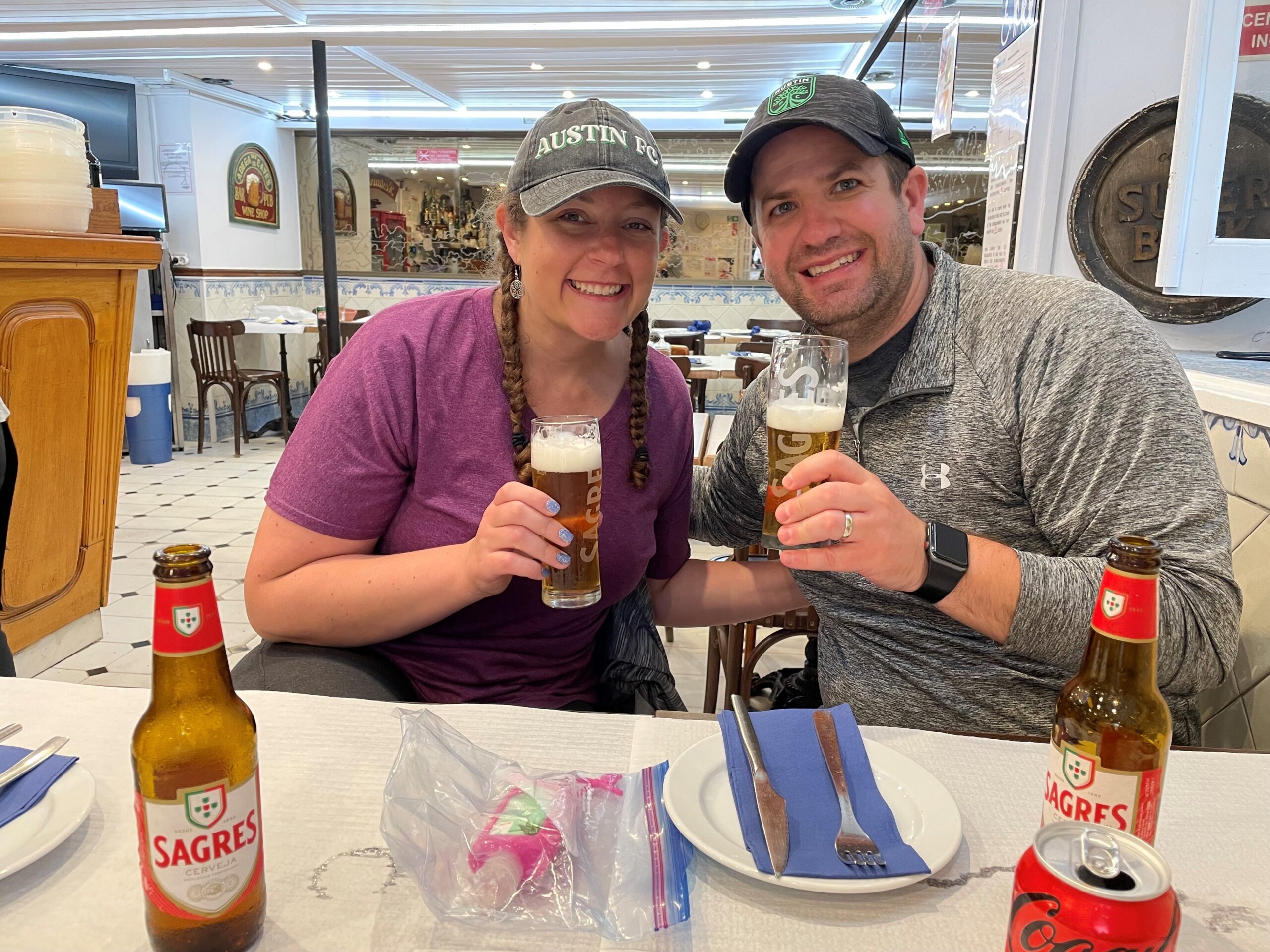 The nice thing about ABD trips is that they take care of everything for you! When changing hotels, we just packed up our suitcases and they will make sure it gets from our room at one hotel directly to our room at the new hotel later that day (so easy!). After breakfast at the hotel, we took a ~3 hour drive to Lisbon. Our guides pre-planned a restroom break at a very nice and clean stop, and had snacks and water for us on the drive. Actually, bottled water was available ALL the time – I never wanted water and didn’t have it available to me the whole trip. On the drive we watched a movie (we voted to watch Coco), had some storytelling, and learned about the area, including what scenery we were looking at, including cork, eucalyptus, and olive trees! I never would have known what these were if we were traveling on our own!