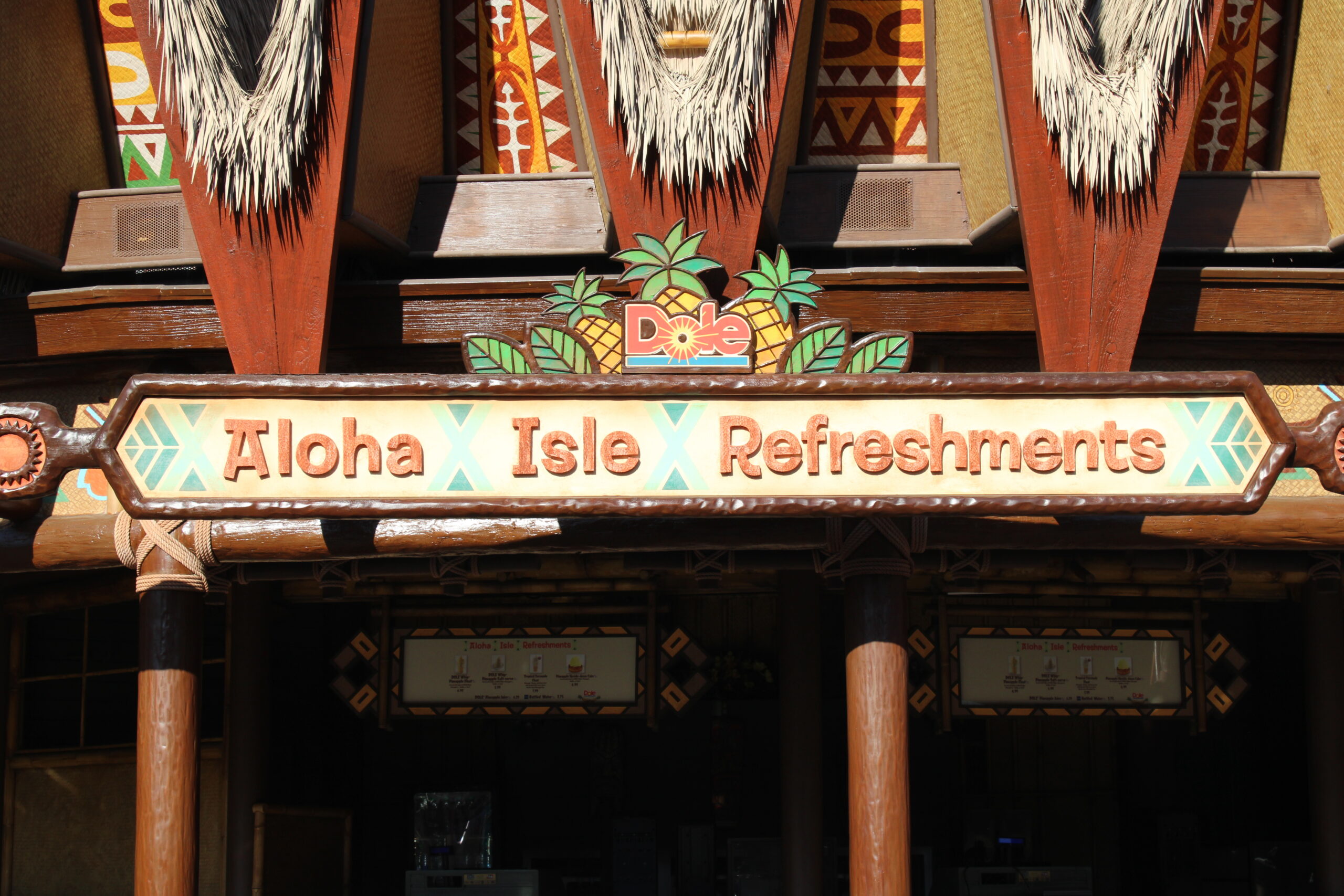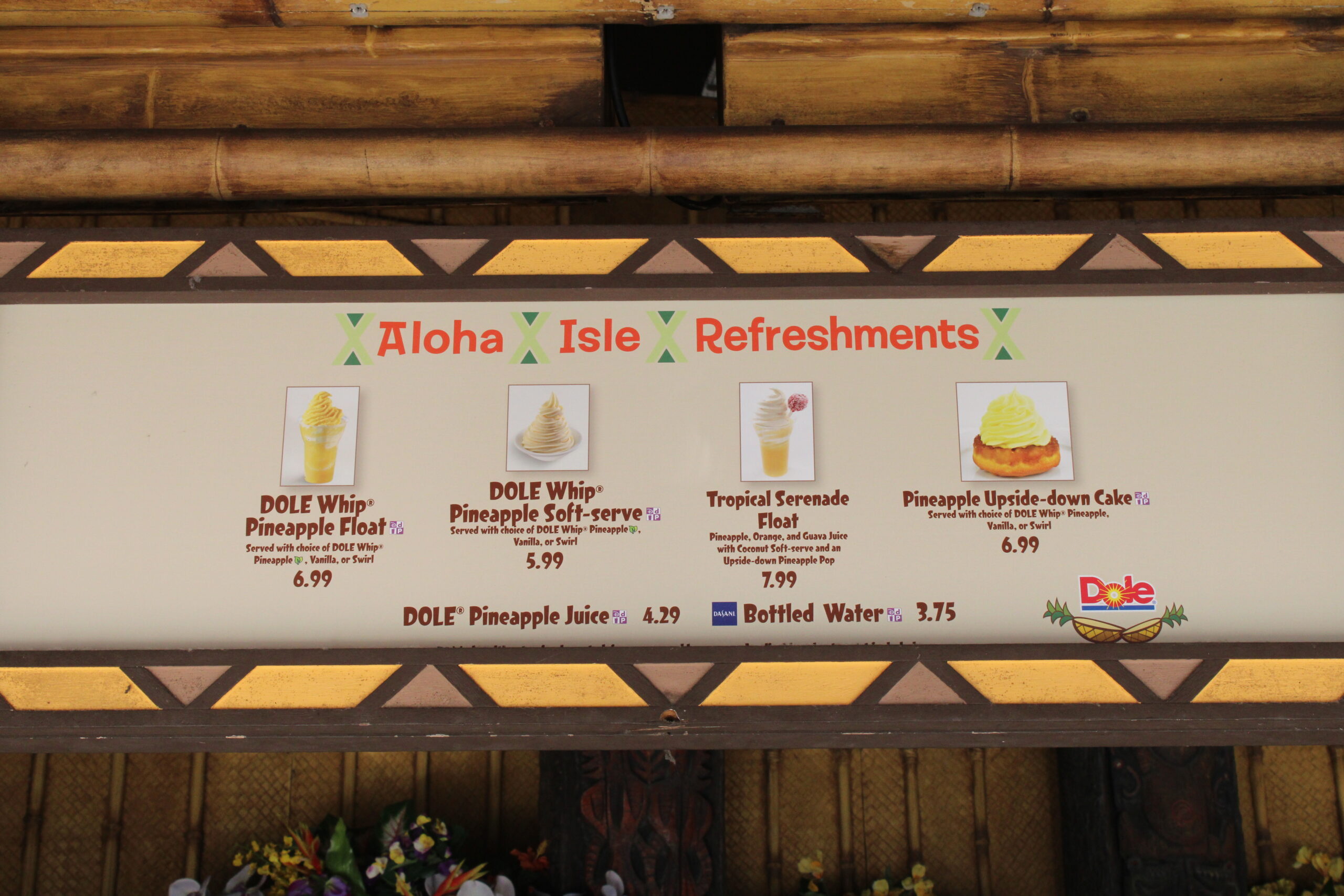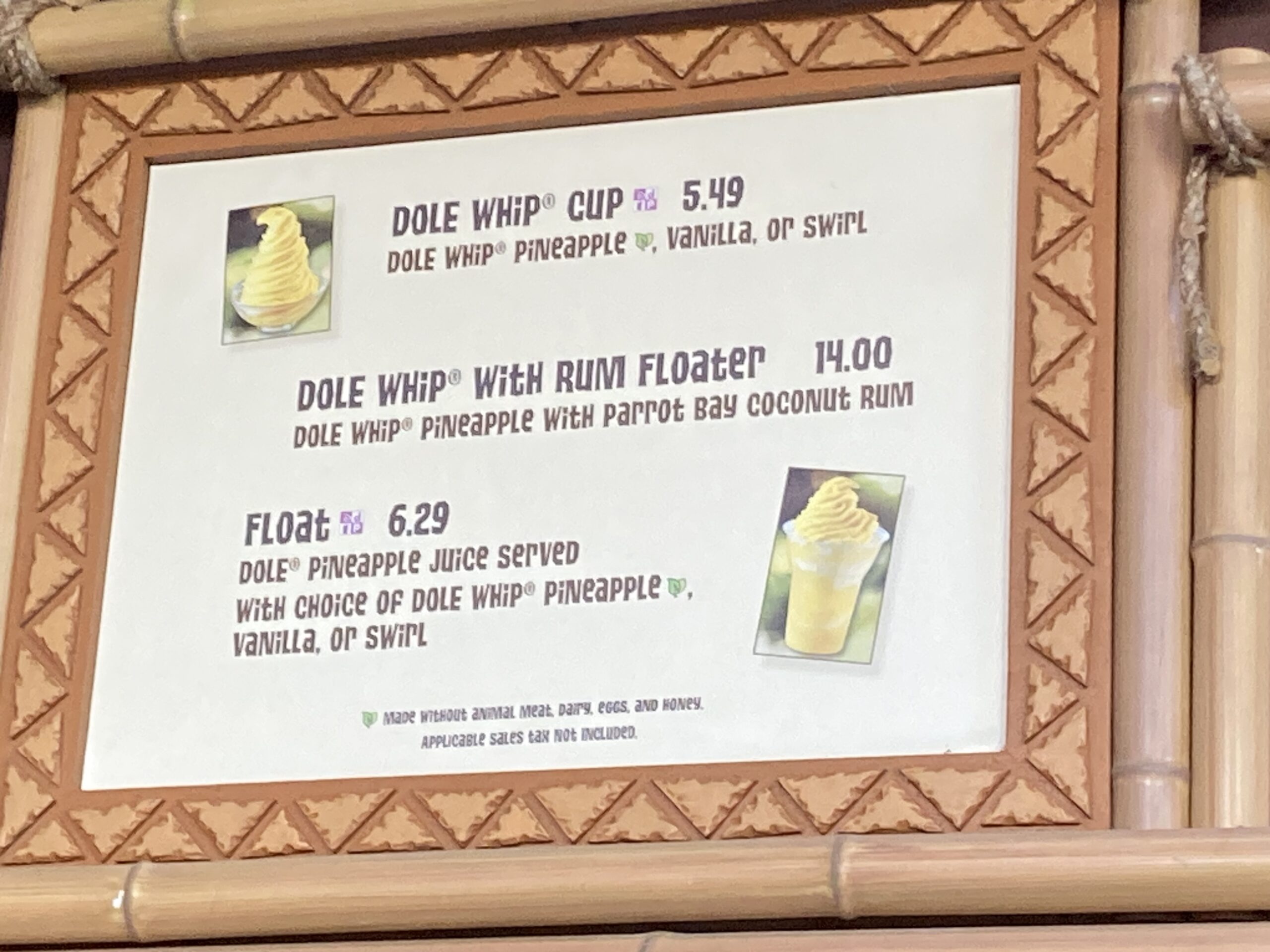 Now that we’ve covered dole whips at the resorts, it’s time to head to the parks! While other parks do offer different dole whip creations from time to time, Magic Kingdom is the OG place to get your dole whip creations and has my favorite dole whip creation of them all! There are two different locations in Adventureland that offer dole whip creations, Aloha Isle and Sunshine Tree Terrace. If you are walking into Adventureland from the castle hub, you will see Sunshine Tree Terrace first on your right hand side—but my favorite creation lies in wait at Aloha Isle, tucked behind Aladdin’s Magic Carpets next to the Tiki Room.