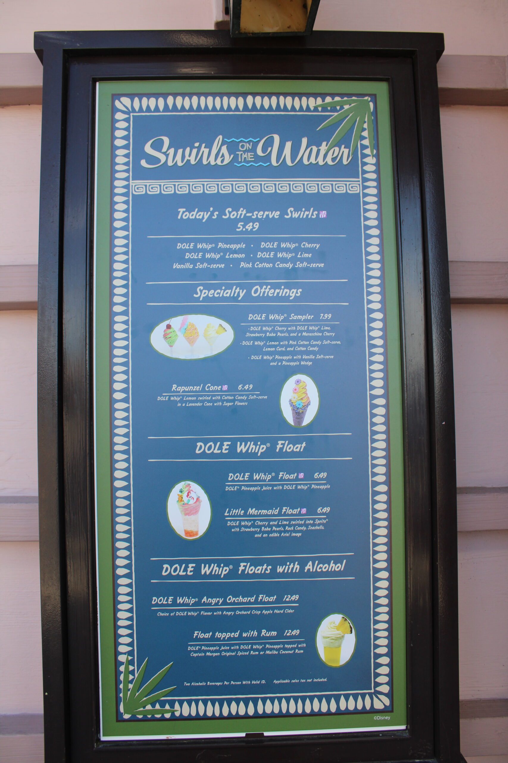 If you look under the “Snacks” portion of the menu, you will see the Key Lime Swirl. This dole whip creation consists of lime dole whip swirled with vanilla dole whip and topped with graham cracker crumbs. If you like key lime pie, you will love this dole whip! It’s quite tart with the addition of the lime flavor, but the vanilla helps to mellow it out a bit and the crumbs taste just like the crust of a key lime pie. This is being offered currently for $5.79, or one snack credit on the Disney Dining Plan.