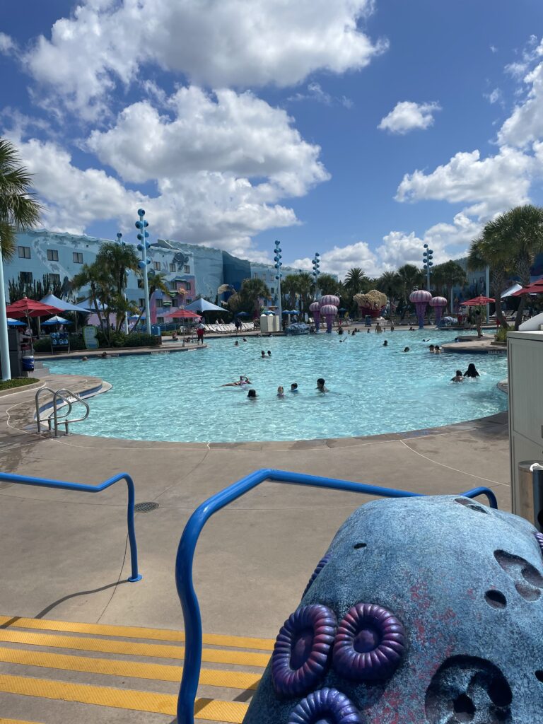 Once you walk outside you are greeted by the cast of Finding Nemo and the feature pool, the Big Blue Pool! Yes if you go underwater you can hear Nemo and friends chatting and singing! Another unique feature of the Art of Animation resort is that the suite buildings have interior hallways. Many find that this is a nice safety feature for children.