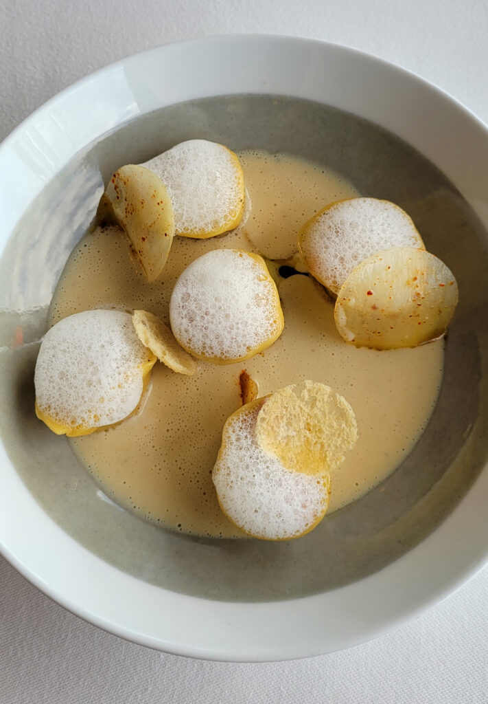 Next, we had Tortellini like no other I’ve ever had. The foam on top and sauce beneath were perfect, together with the cheese disks. These were delicious bites that I cut in half to take my time and savor each bite.