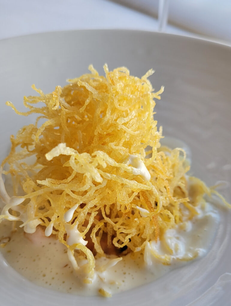 We didn’t know what the Hommard, Pomme De Terre course was until they described it as lobster and potato. When the plate was served, we had a beautiful presentation of delicate strings of potato topping the fish.