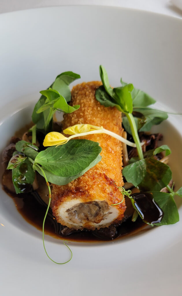 The main course was Poulet Rouge, a North Carolina dish that’s a tube of chicken filled with a mushroom sauce. One person at our table didn’t care for mushrooms so they substituted a Wagyu Beef instead.