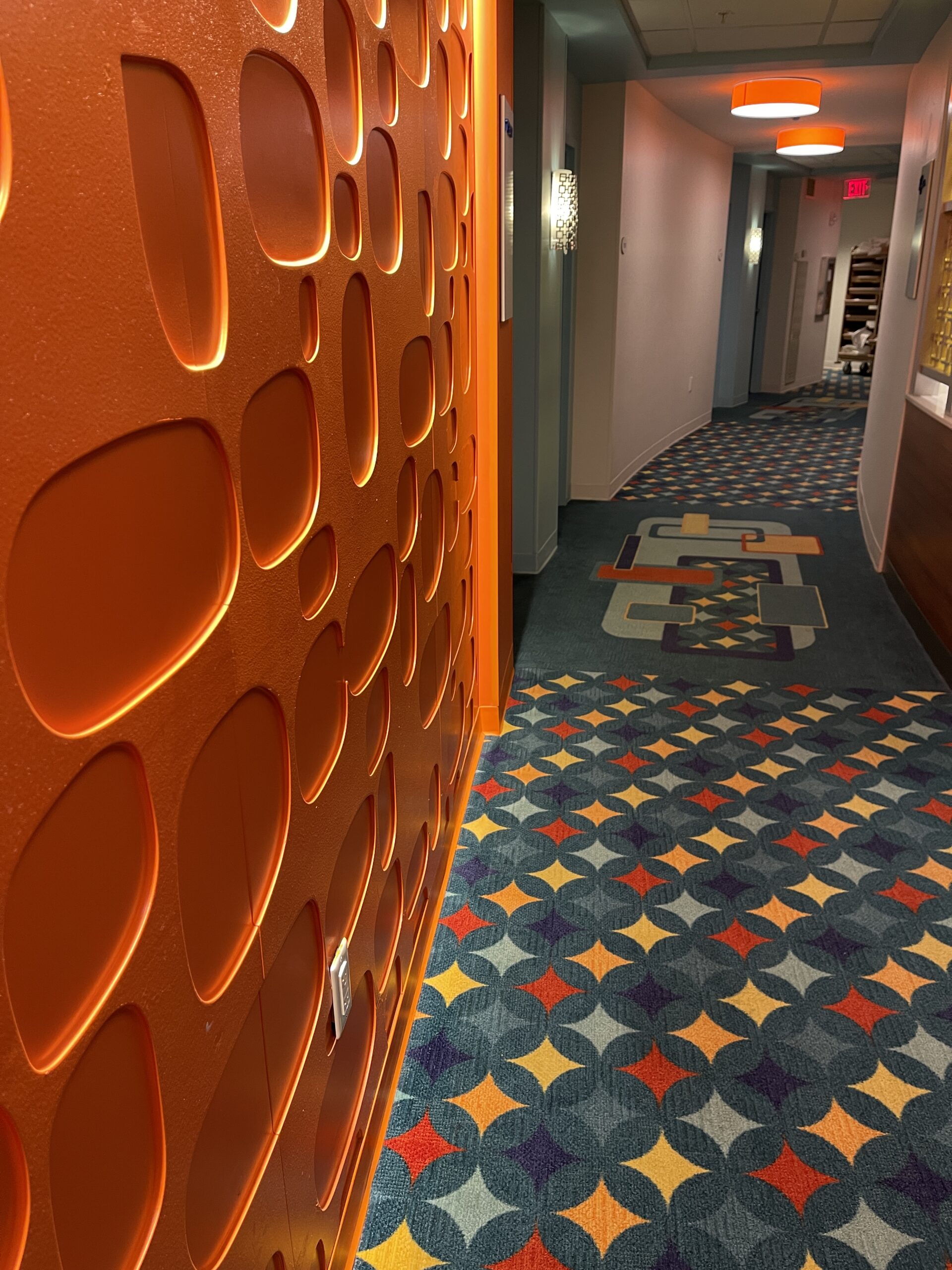 For those of you that are up on 50’s and 60’s style, space travel became a big deal in art and design. Big bold polka dots, stars, boomerang shapes, and strips are carried out in all of the buildings. The mid-century style is everywhere. It is carried right into the rooms which are so much fun. Everything I remember from being a kid. My favorite was the cone shaped bed lamps hanging from each side of the beds. Orange and turquoise decor spills out throughout the room. Swirling lava like colored headboards, Scandinavian style dressers and lamps accompanied the room. There was even an electric Westinghouse clock on the side table...priceless!