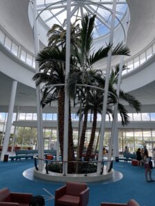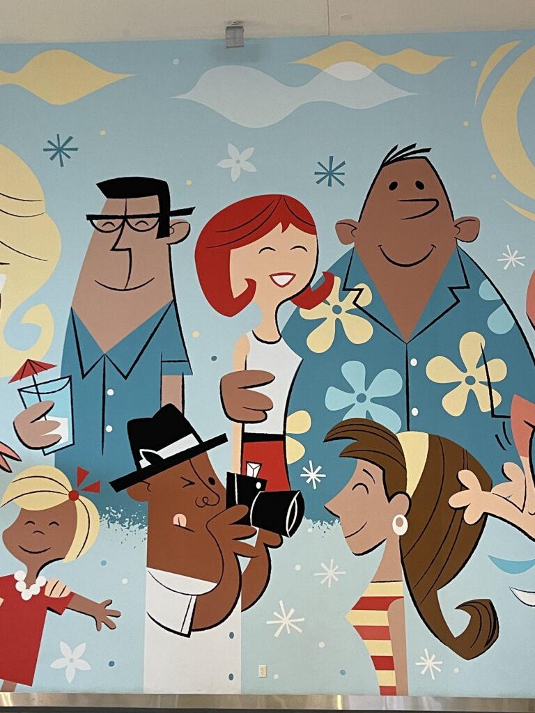 I had the opportunity to visit Universal Orlando and stay at one of their prime value resorts. The Cabana Bay Beach Resort is definitely one of the best and affordable step-back-in-time experiences you can get. This 50’s and 60’s themed resort is one of a kind. Neon lights, chrome, vinyl chairs, Formica topped tables, pinks, turquoise, mint green, pale yellow, and blue were at every turn. From the moment I stepped on the sidewalk to the resort I was energetically greeted by neon stars and lines, bubble shaped windows, palm trees, tall sculptures, and arrows blinking their welcome. Mid-Century design, here I come! I literally went into a time machine. The only thing I was missing was my Dacron golf hat and my cardigan sweater. I know, too hot for the sweater.