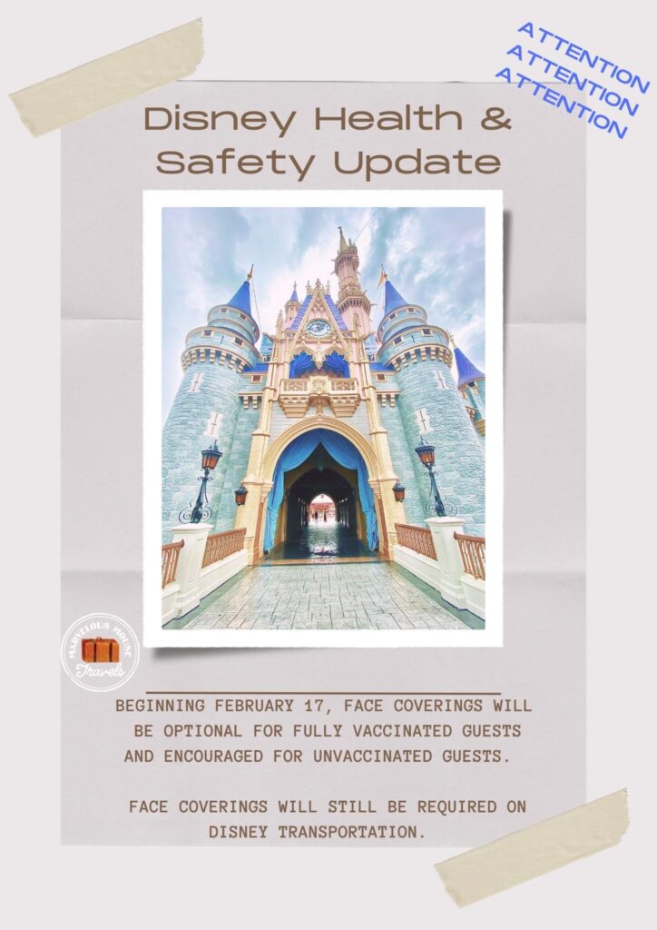 Over the last few weeks we have been seining different changes being made in health and safety policies. This week a statement from Walt Disney World and Disneyland has been released stating the mask mandate will be changing on February 17th. Guests who are fully vaccinated will no longer be required to wear masks indoors. Face coverings are still required by all Guests (ages 2 and up) on enclosed Disney transportation, including Disney buses, monorails, and Disney Skyliner. It is suggested that if you are not fully vaccinated you still wear a mask when indoors and as always for everyone to still honor social distancing.