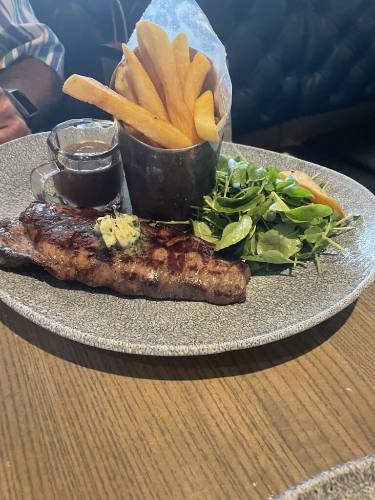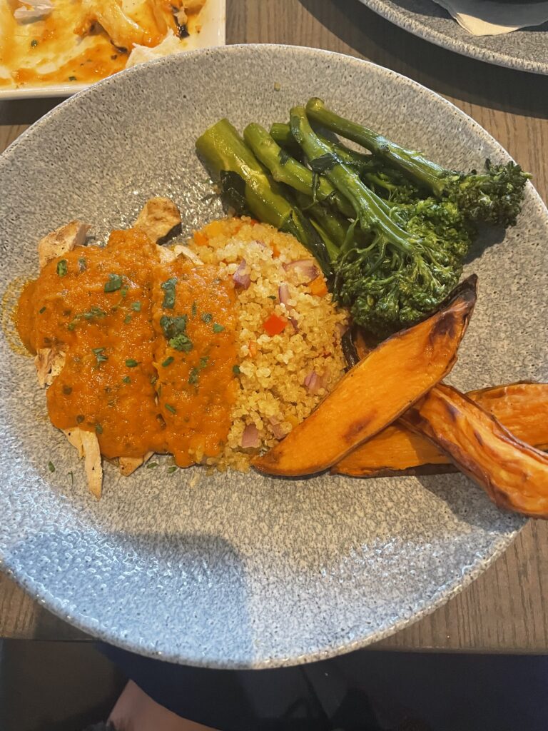 Next was the main course- we had a steak with fries and a side salad, and a curry protein bowl with grilled chicken. The protein bowl is meant to be served with vegan sausage, but I asked to substitute with grilled chicken, and they did with no issues at all! Both meals were cooked perfectly, and we couldn’t have been happier!