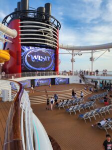 Your Disney Cruise on the other hand is much more relaxed, and what they don’t have in rides they definitely make up for in entertainment! Each Disney Cruise ship is equipped with pools and waterslides on the top decks. The Disney Wish in particular has the first ever attraction with the AquaMouse!
