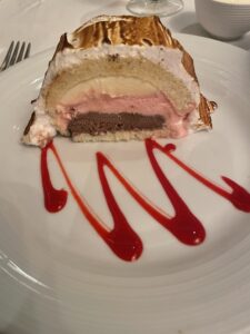 The food prepared is the same across all 3 dining rooms. Appetizers included French Onion soup, Caesar Salad, fruit and cheese plate and garden, pumpkin soup and shrimp cocktail. Entrees included baked polenta, New York Strip, Fried Chicken, Coq Au Vin and Eggplant Parmesan. Desserts included Key Lime Pie, Carrot Cake, Cheesecake, Molten Lava Cake and Baked Alaska. The first night was a formal night and the rest were casual so make sure to bring those dress up clothes for a great family picture before dinner.