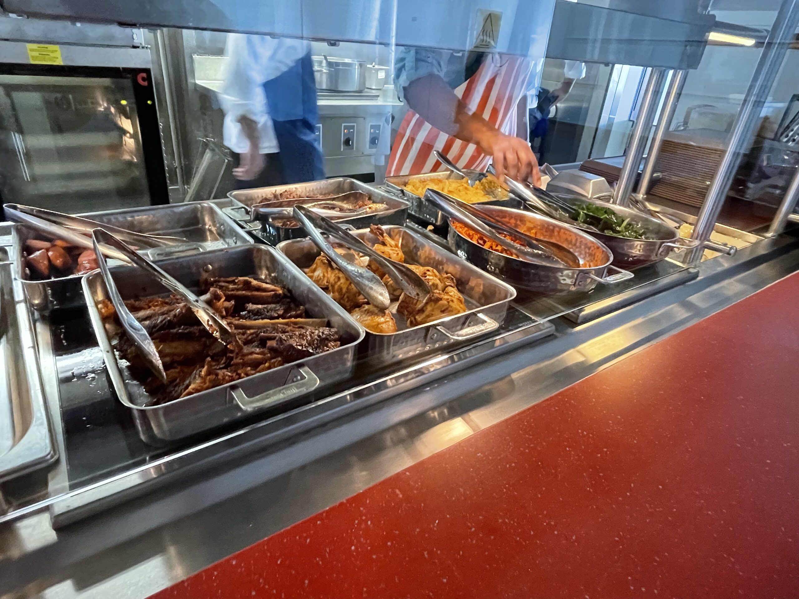 Options include seafood, comfort foods, bakery items, classic American dishes, vegetarian options, soups, salads, and a beverage bar.