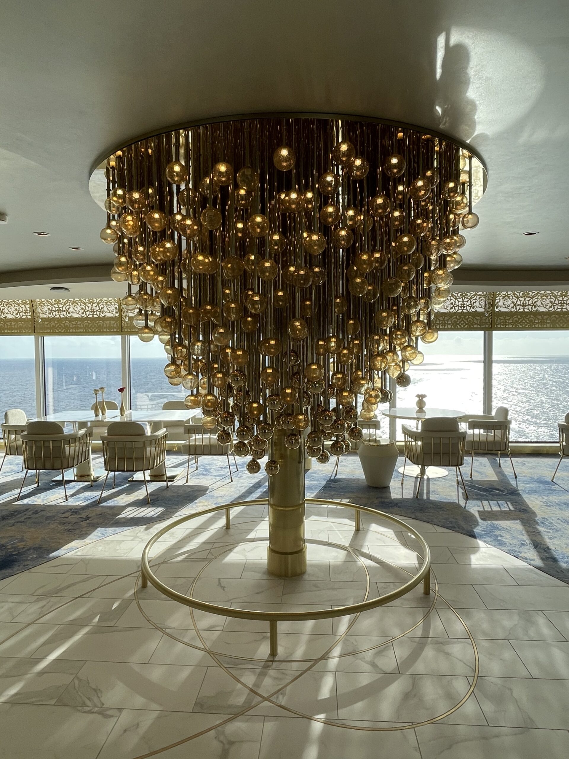 Be sure to look closely for a flurry of special touches that bring the Frozen story to life. Invisible fiber optics embedded in the ceiling above portray Elsa’s icy powers, while windows magically transform from real-time ocean views to the colorful dancing lights of the Aurora Borealis.