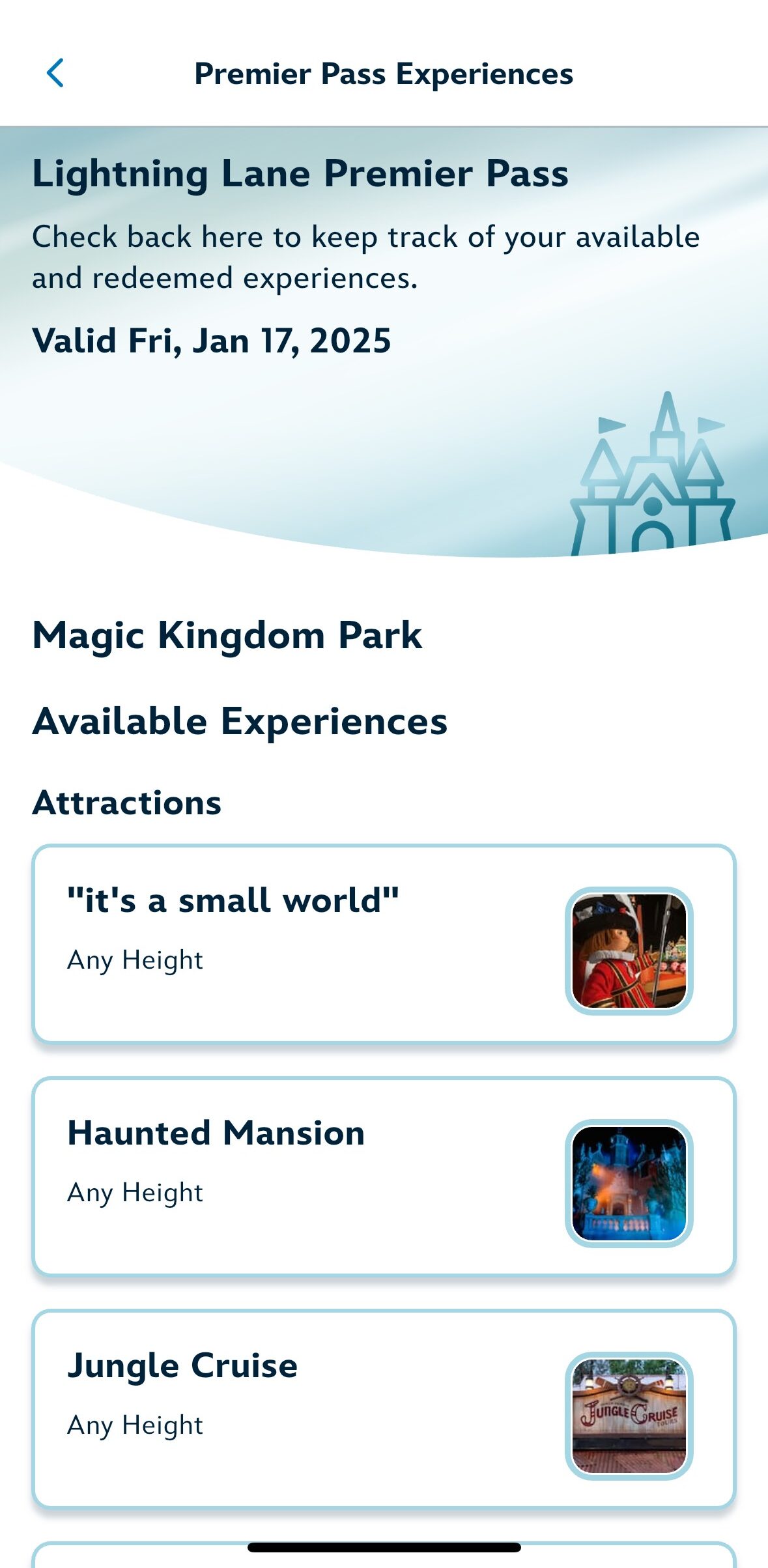 I visited MK on January 17th, 2025 which is the Friday of a holiday (MLK) weekend. I went with my 12 year old son and we had limited park days so I wanted to make sure we were able to maximize our time in the most effective way! The hours for Magic Kingdom were 9:00 am to 11:00 pm and since I knew we would not need 14 hours in the park with the Premier Pass, we decided to have a leisure morning at the hotel. We headed to the food court for some breakfast around 10:00 am and then waited for the bus and arrived at Magic Kingdom at 11:00 on the dot. There were 19 experiences available this day.