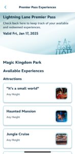 The Premier Pass at Magic Kingdom (and the other 3 parks as well) is a high-tier, VIP-style access pass that allows guests to enjoy expedited entry to attractions, premium experiences, and exclusive perks throughout the park. With the Premier Pass, guests can bypass traditional standby lines and enjoy Lightning Lane access to every attraction that offers Lightning Lane, without having to book them individually. This allows less waiting and more riding, which is a game-changer, especially during peak seasons. Unlike regular the regular Multi-Pass where users must reserve one attraction at a time, Premier Pass holders get instant access to multiple rides, including Individual Lightning Lane selections!