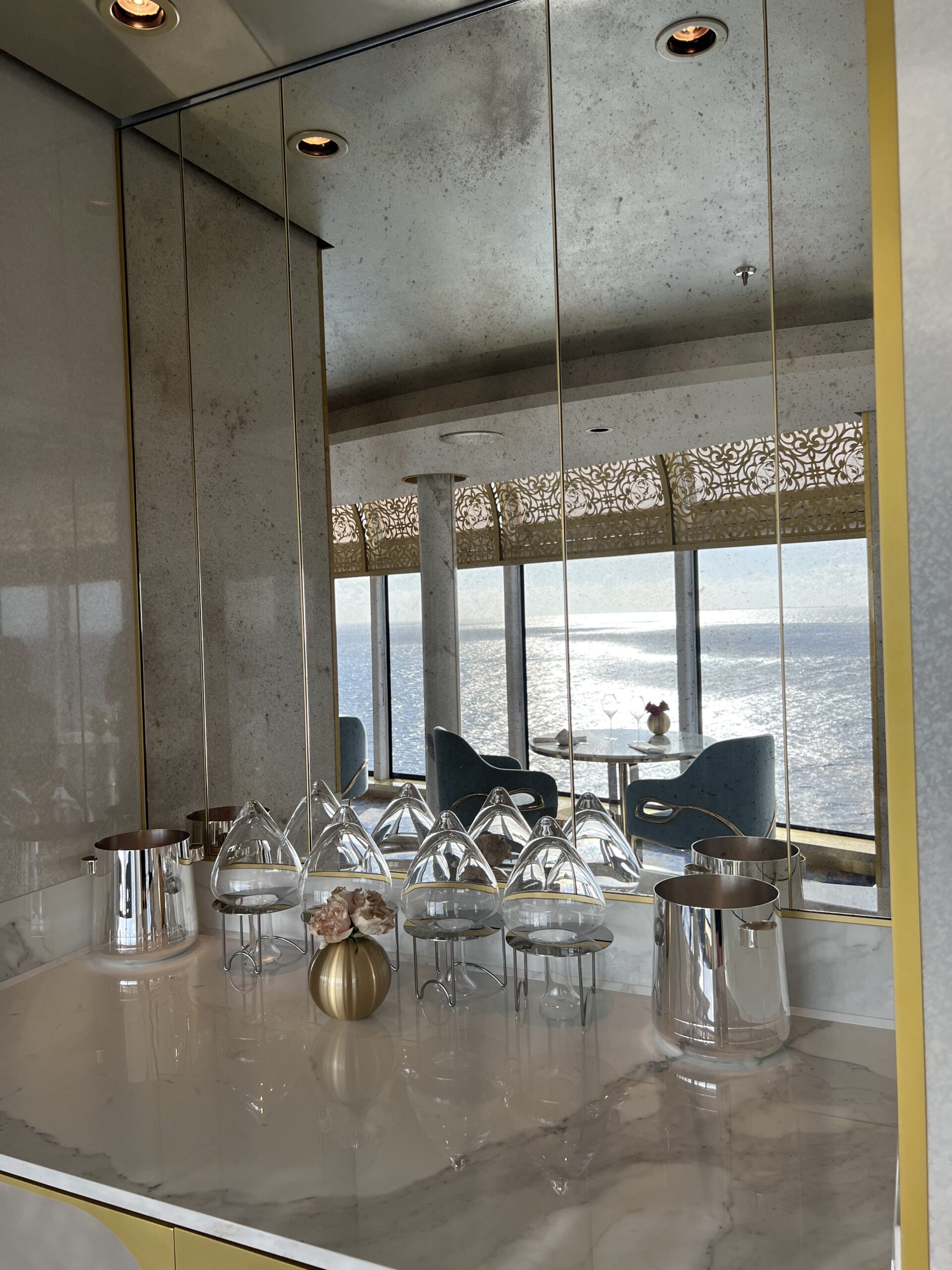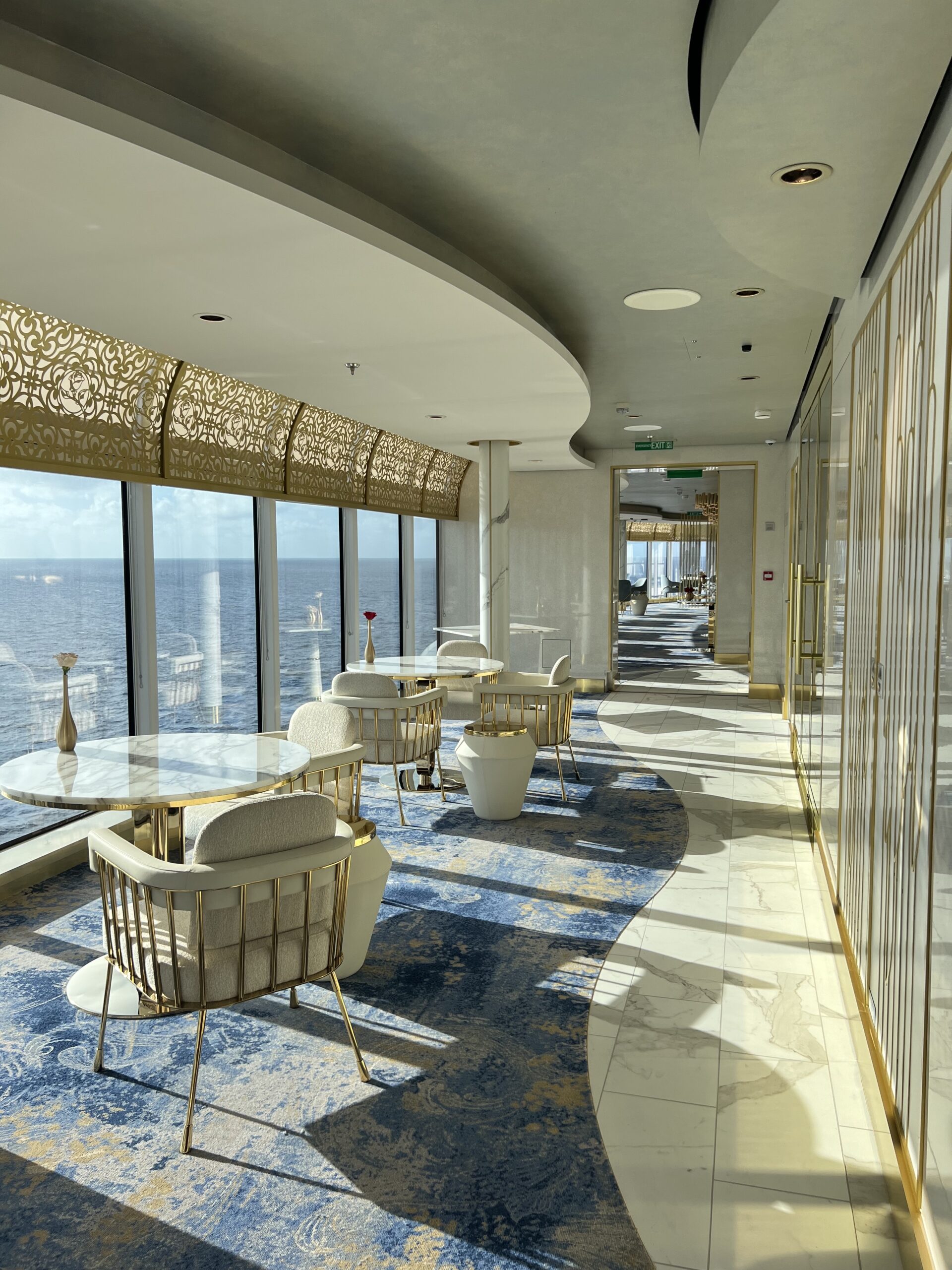 I have seen some pretty amazing restaurants, and this is one of the top. From the second you walk in, you are greeted by a huge chandelier, ocean views, beautiful golden furniture and charming music.