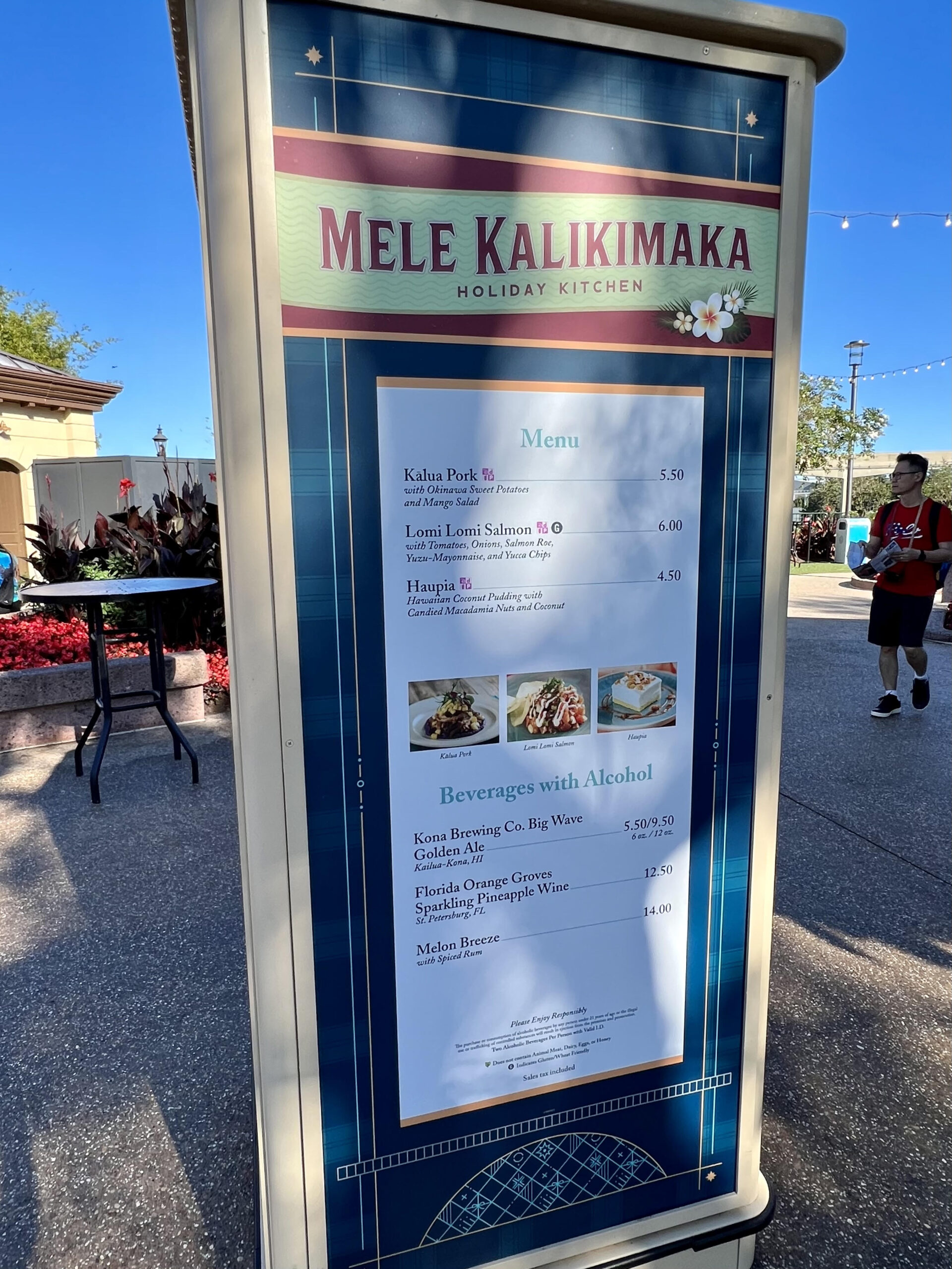 If you’ve attended a festival at EPCOT before, you will be familiar with the themed “kitchens” throughout the park. You will find traditional holiday fare from around the globe, located throughout the park. The festival passport has a list of each kitchen and their menus. The items are sample-size portions, perfect for grazing around the world! My personal favorite was the Lomi Lomi Salmon with tomatoes, onions, salmon roe, yuzu-mayonnaise, and yuca chips. This is located at the Mele Kalikimaka kitchen near Port of Entry.