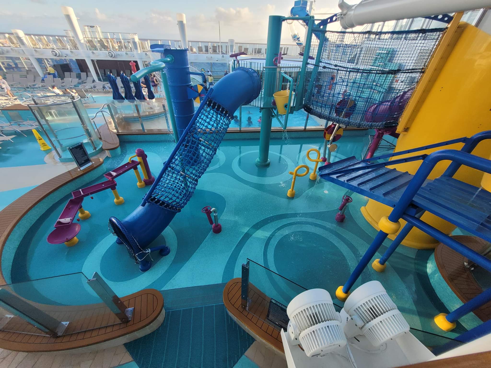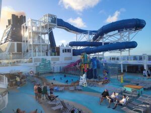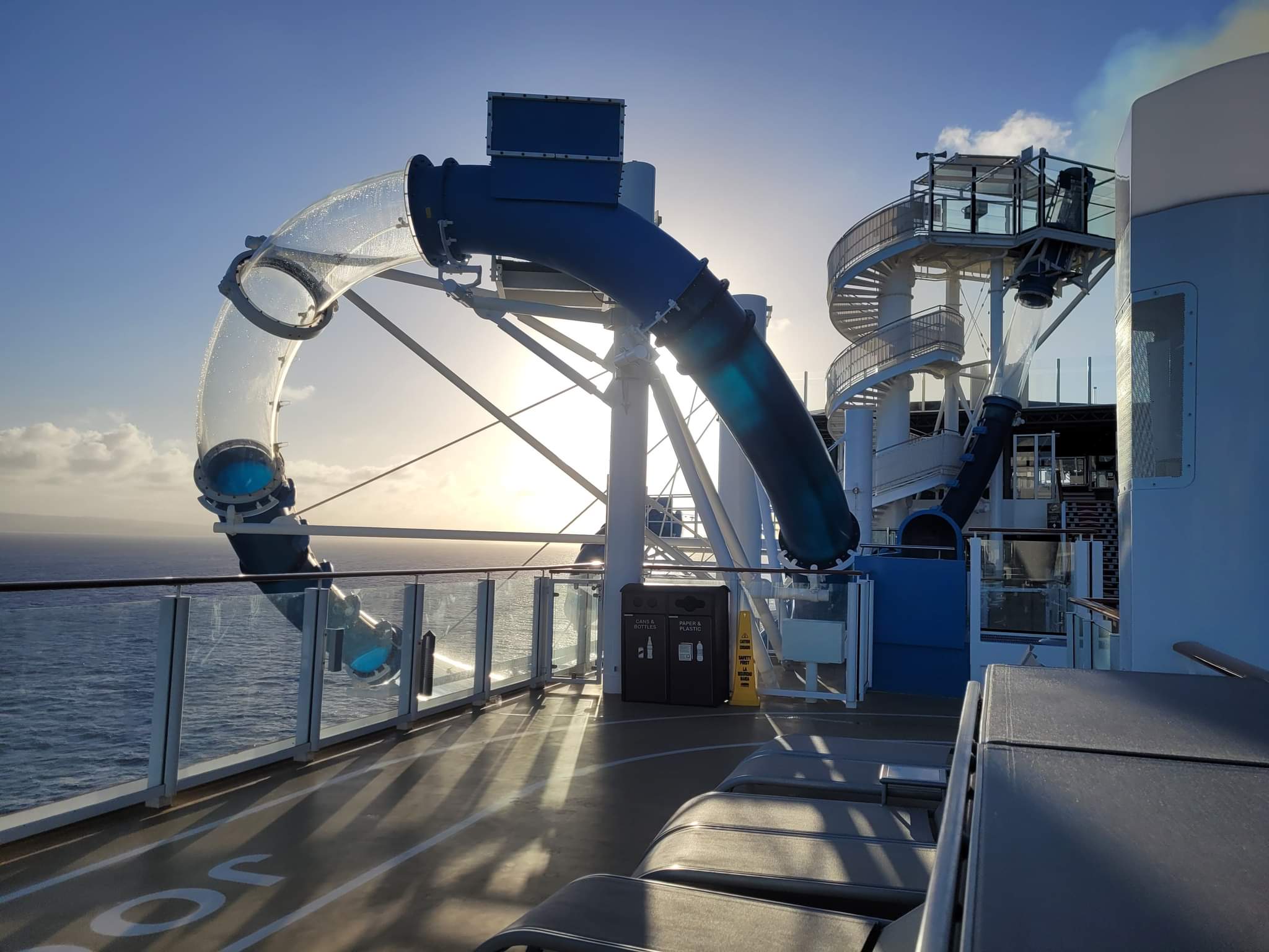 Ready to splash around and have fun? The Norwegian Encore has a Kids’ Aqua Park complete with water cannons, slides, and tipping buckets. This area is separate from the two large pools and two multi-story waterslides on the lido deck, which are referred to collectively as the “Aqua Park.” The Aqua Racer is a tandem tube slide where you and a partner ride an inner tube down several stories in anticipation of the BIG splash at the end! Ocean Loops is another slide onboard the Encore, although it is not for the faint of heart!! This partially clear tube slide extends over the side of the cruise ship and makes two big loops as you fly downward toward the end of the slide. Both the Aqua Park and Kids’ Aqua Park are accessible to cruise guests at no additional cost.