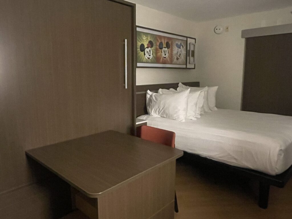 Disney's All Star Movies Resort has both Standard and Preferred Rooms. Preferred Rooms are rooms that are located closer to the resort's dining area, transportation hub, and shopping area. At the end of the day, it's nice to keep the steps to a minimum as you walk off the bus and head to your room to put your feet up or grab a nice shower! Preferred Rooms do run slightly higher price-wise as a Standard Room. Both room types have either a King Bed, or a Queen Bed and a Queen-Sized Table Bed, depending on your party size. The table beds are super easy to pull down and put back up as needed! My family pulls the bed down at the beginning of our stay and leaves it down the entire time. We stayed in a Standard Room (no more strollers and the kids are older) and enjoyed our room. The beds are comfortable!