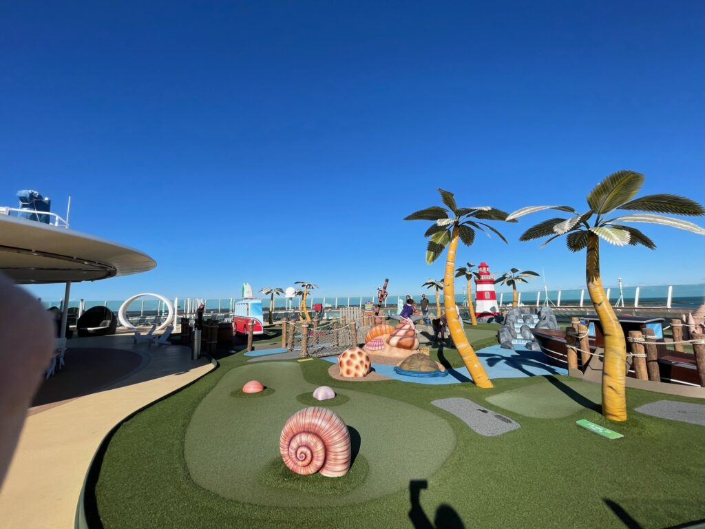 Looking for sports? How about a mini golf course? Or how about a little one on one on the basketball court? Feel like rock climbing? Independence of the Seas has it all! Get ready for some jaws to drop when the kids see these amazing activities available for them on this ship. While I personally didn’t climb the wall, I can only imagine what the view is like from the top. The mini golf area is the perfect spot to work on your putting, while the kids have a ball.