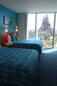 One of the best things about Cabana Bay is that it offers a wide range or room accommodations. Family suites that can sleep up to 6, two-bedroom suites that can accommodate up to 8, and standard rooms for a family of 4, this resort can something for every family. Rooms that open to the outside pool area or inside are also options for you. Want a room with a view? Many rooms offer pool view, but my absolute favorite view is the Volcano Bay view!!! For just a few dollars more a night you can look out your