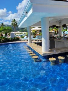 Are you hungry? If so, Moon Palace Jamaica has you covered! There are food choices for every taste bud. There is fine dining at La Gondola that includes some of the most delicious Italian delicacies as well as a fun hibachi experience at Momo. You can also dine casually at the buffet, Buccaneers which is open for breakfast, lunch, and dinner. While at the pool and beach, you will need to get some jerk chicken or pork at the Jerk Hut. Need a sweet treat (I always do), then I highly recommend stopping by Boulangerie which is open 24 hours! Plus, there is 24 hour room service you may order from the Palace app or on the TV. No matter what you want to eat, there are several dining options to experience while staying at Moon Palace Jamaica.