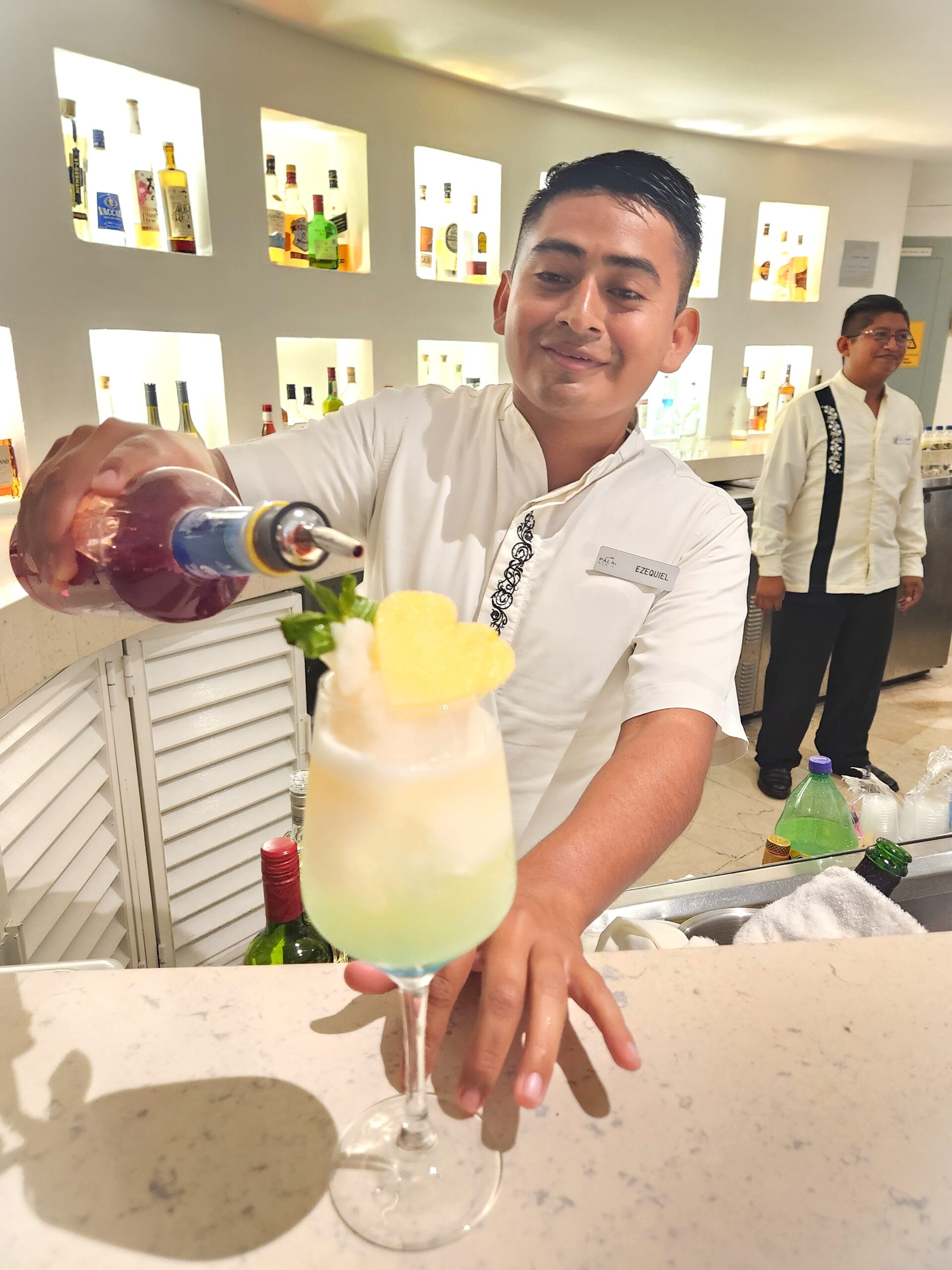 Right off the beautiful open atrium style entry to Playacar Palace is the Lobby Bar. Here, I was lucky enough to meet Ezequiel, pouring drinks with the biggest grin on his face. I asked him to make me his favorite mocktail. He didn’t clarify if it was his favorite to make or his favorite to drink, but he definitely enjoyed entertaining everyone while creating this masterpiece with Cotton Candy, Pineapple, Lime juice syrup and Peach Syrup. Look at that cute pineapple heart on top! Ezequiel calls this drink “Something Beautiful”, for obvious reasons!