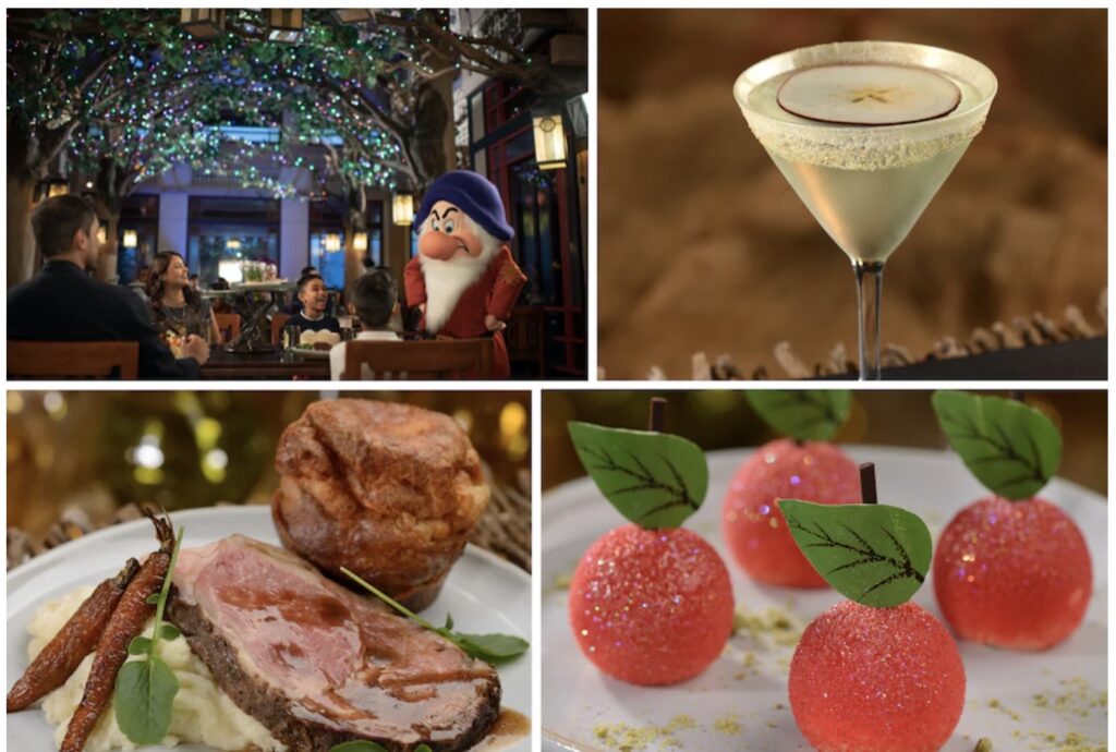 Story Book dining will be available to book starting December 2 with tables to begin seating December 16 of this year! This character dining experience Guests will see Snow White, Dopey, Grumpy, and The Queen stroll through the Enchanted Forest as the dining room transforms throughout the evening as if they are really outside. The menu is a prix fixe dinner with the choice of individually plated entrées and shared starters and desserts. For example, Guests can start their adventure with a wickedly refreshing cocktail like the Enchanted Apple with a hint of sour apple. The Royal Prime Rib Roast and the vegetarian A Stroll Through Nature are both returning as well as the decadent “Poison” Apple dessert with dark chocolate-apple mousse. Each option is a piece of the story the guests are getting to experience.