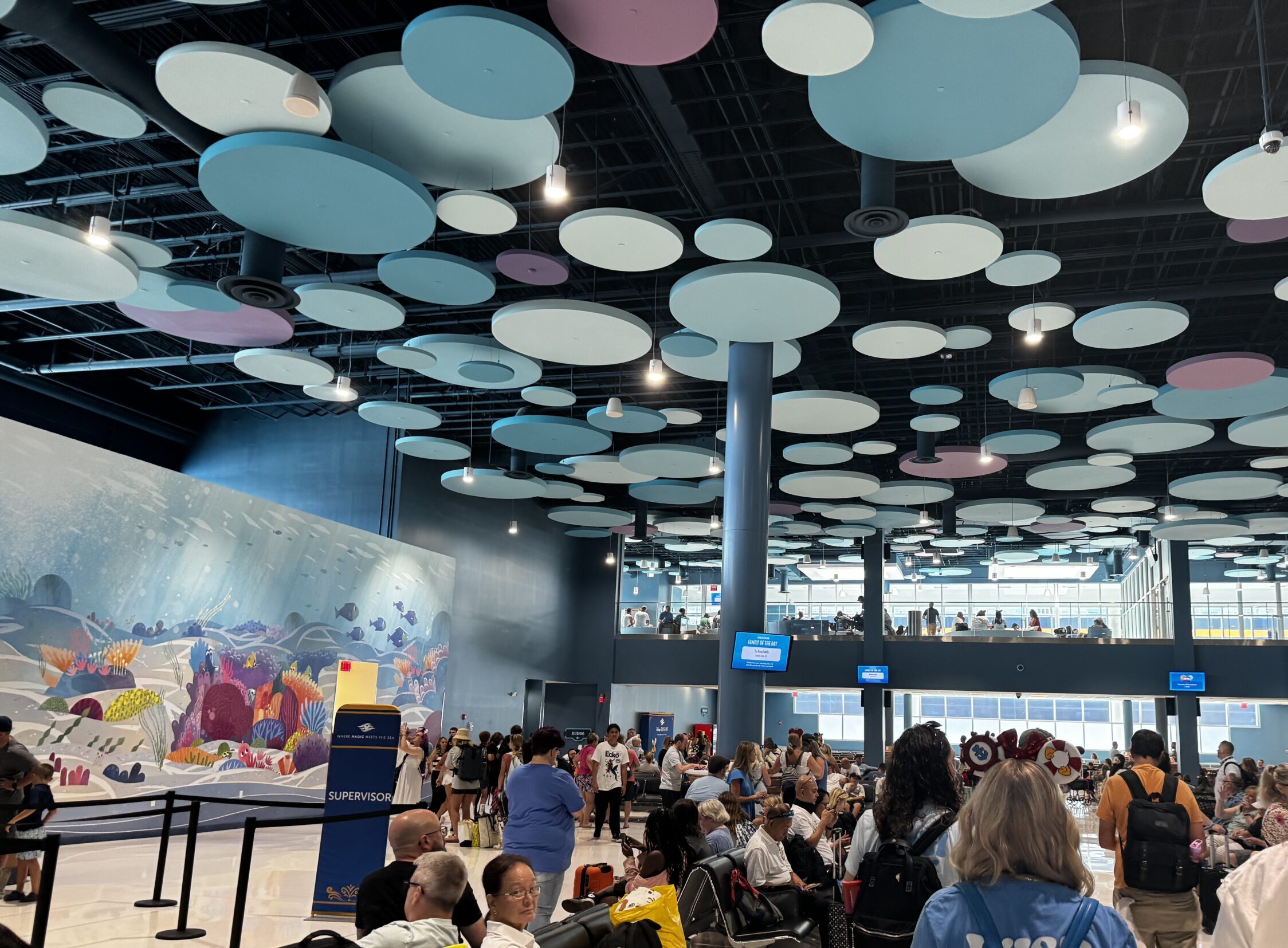 At the terminal, porters are waiting for those who have not yet handed over their baggage (certain shuttle companies collect these ahead of time for guests) and help whisk away the luggage so it is not a worry for guests. If sailors forget or lose their luggage tags, it is not a concern, as the porters have extras. Inside the terminal, the theming continues with colorful accents, interactive displays, and plenty of photo ops to begin documenting the memories made on vacation.