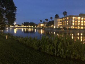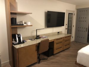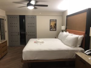 Our king-sized water view room in the Casitas area welcomed us with crisp, white linens, Southwestern colors and décor, a Mickey towel decoration with welcome letter and so many “upgrades” that you cannot see in the photo! Each bedside table came equipped with USB charging stations, personal reading lamps on each side of the headboard, and large surfaces for all of your travel items!