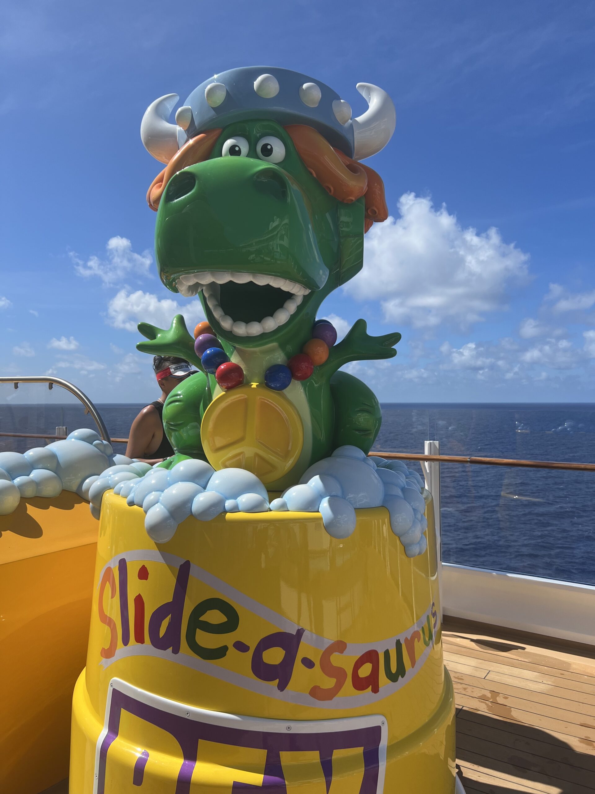 The Slideasaurus Rex is the cutest slide for kids! It starts in one of the funnels and ends right by Rex and the Toy Story themed splash pad.
