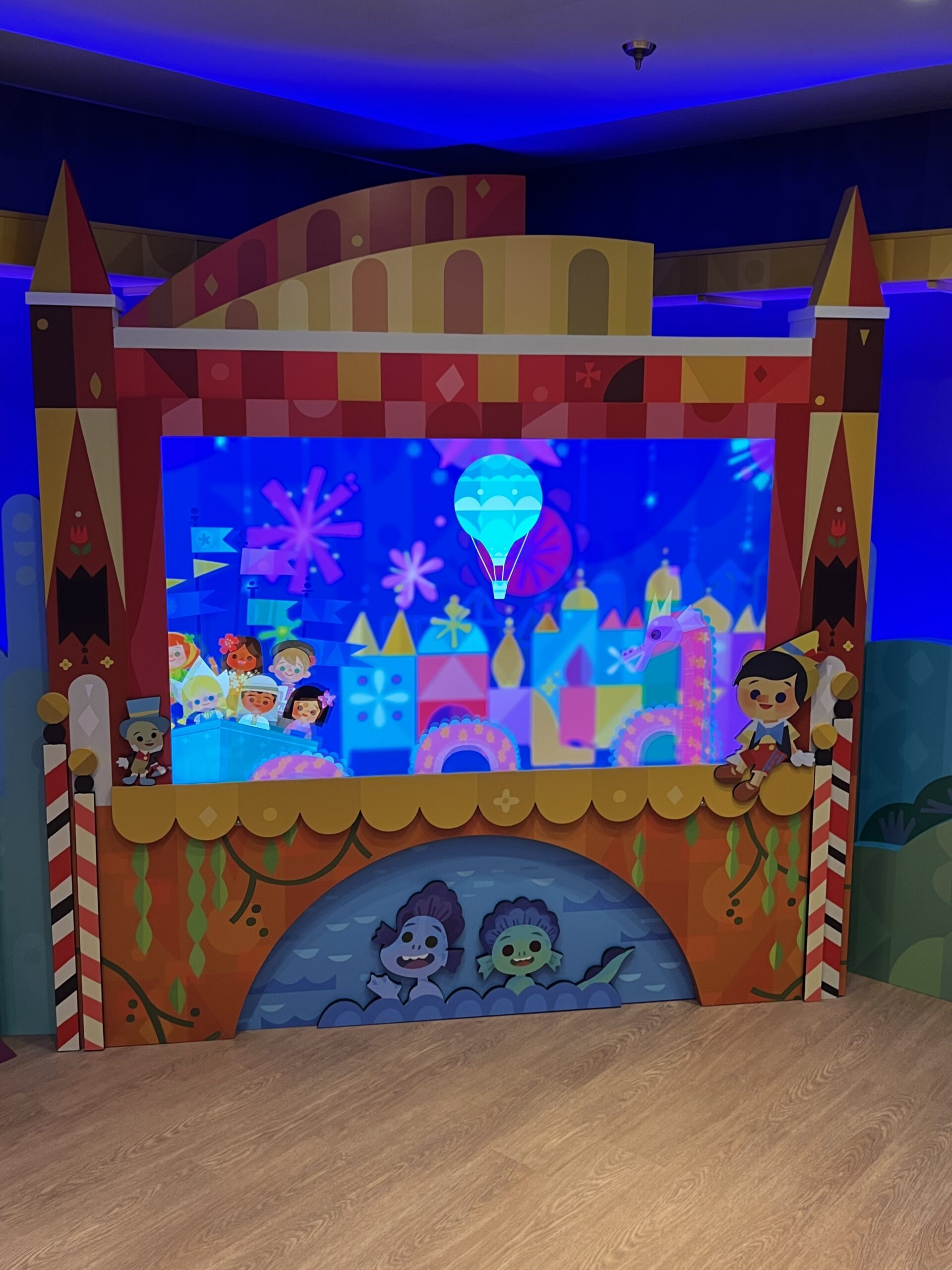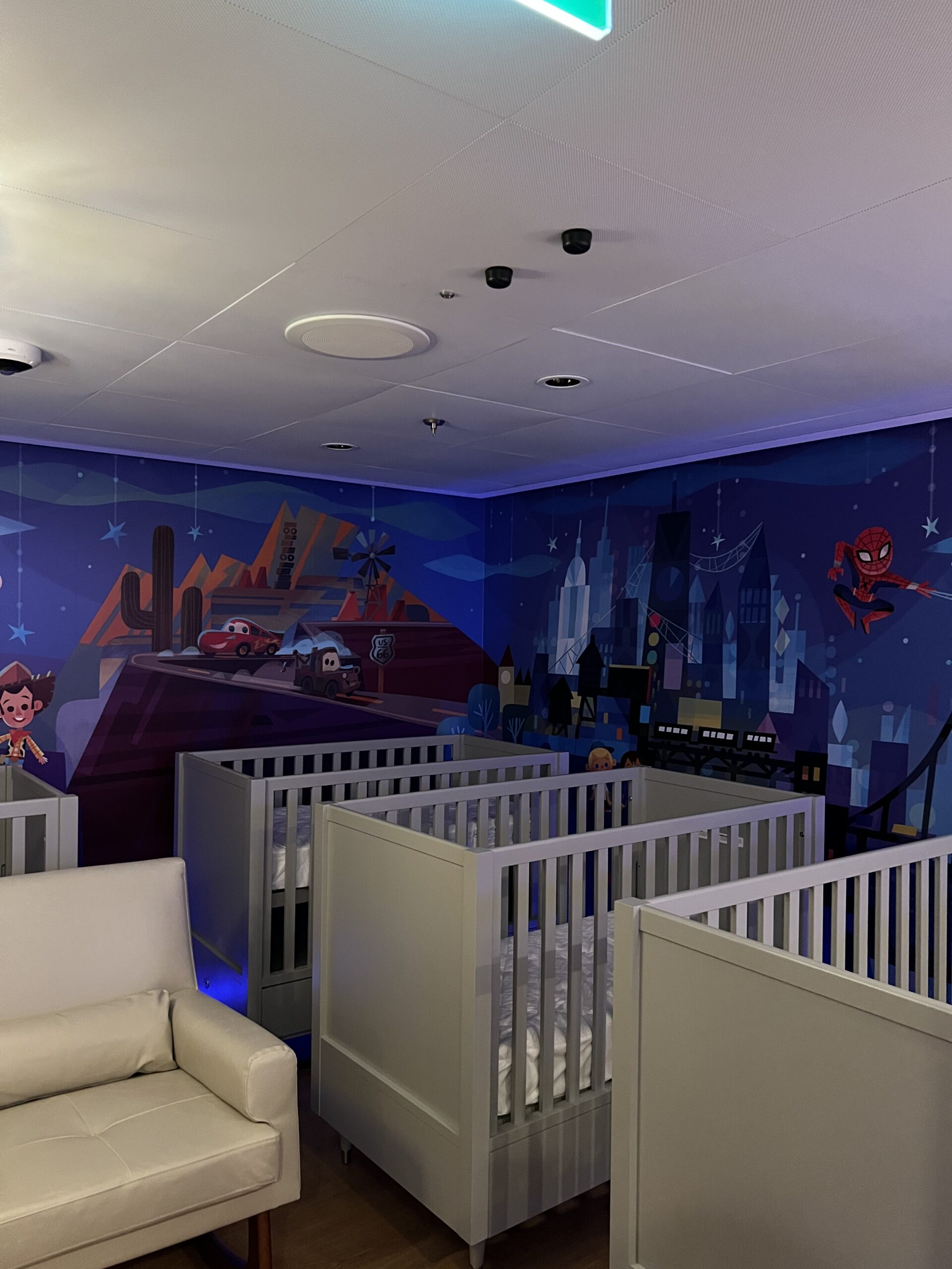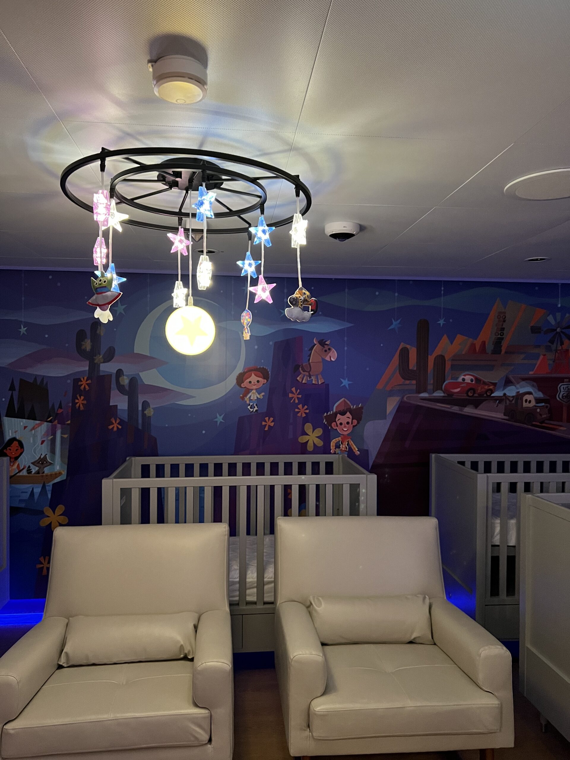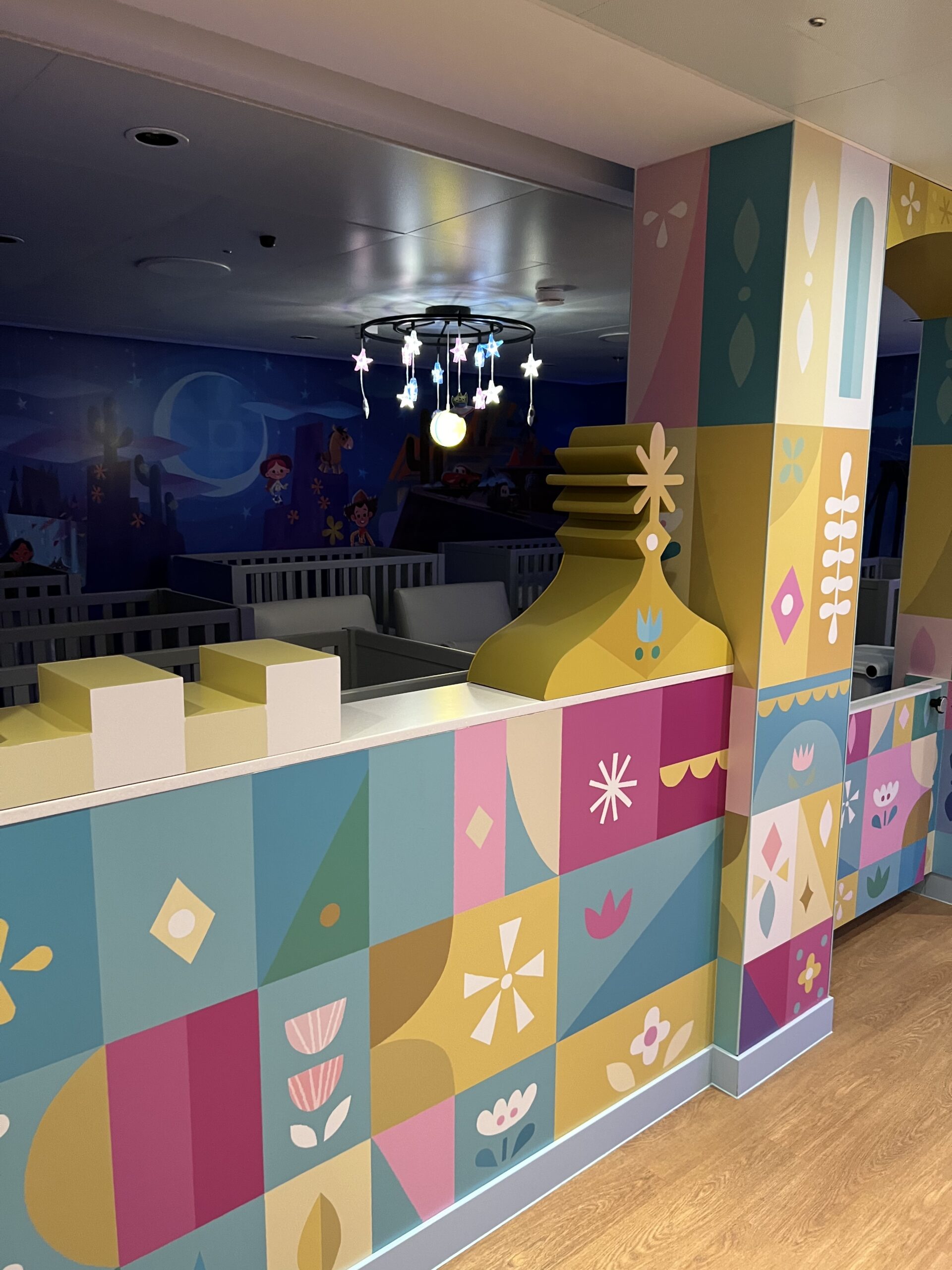 One of the very best parts of Disney Cruise Line, is getting to have some adult time at the same time as your kids are having the time of their lives in the kids club. The Small World nursery aboard The Disney Wish Is interactive, bright colors and perfect for babies! The price is $9 per hour per kid (at the time of writing this.)