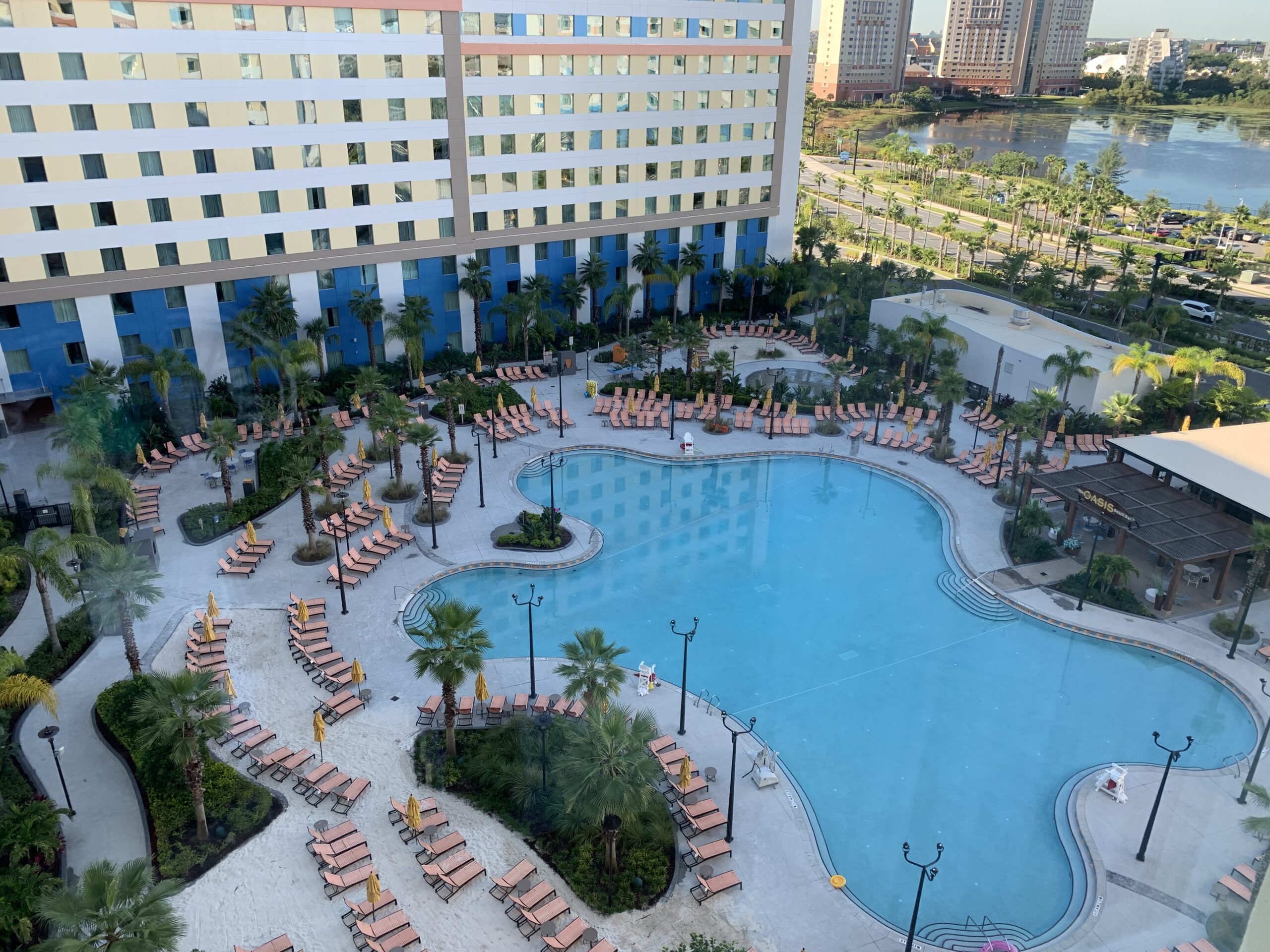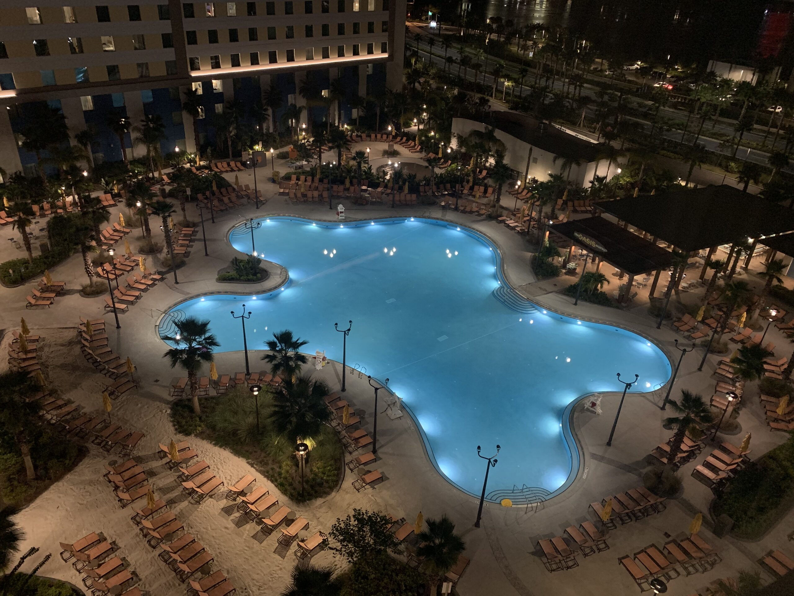 We were lucky enough to get a room with a pool view, and the views of the pool were just as gorgeous at night as they were during the daytime! Dockside Inn and Suites has two large resort-style pools on its property; each has its own poolside bar and an ample number of deck chairs for its guests. The pool near Tower 2 even features a zero-entry pool with sandy beach area, making you feel as if you were truly on a tropical island, instead of at the hotel pool on International Drive! For those of you with little ones, feel free to take them to the kids’ splash pad area for extra fun!