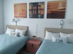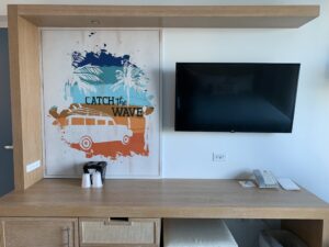 Dockside Inn and Suites, one of Universal’s two Value Hotels, features more 2-bedroom suites than standard rooms in its two U-shaped towers. These 2-bedroom suites accommodate up to six occupants, while the standard rooms, which are 313 square feet in size, all feature 2 double beds. It is interesting to note, however, that there are no king bed options at Dockside Inn and Suites. The decor of the rooms is simple and clean, and is complimented with beach-inspired designs and island-themed colors; the sign in my room even encouraged me to, “Catch the Wave!”