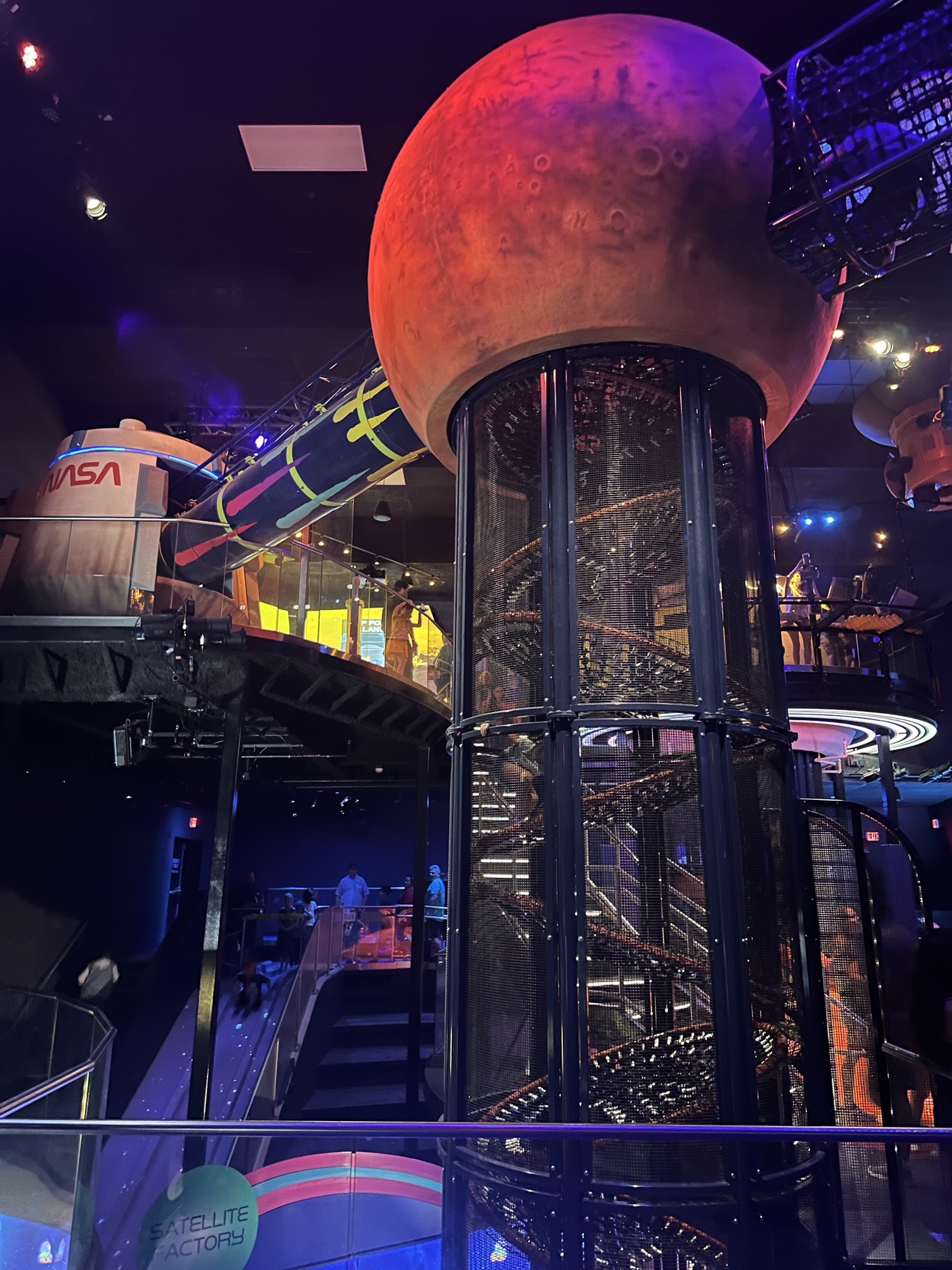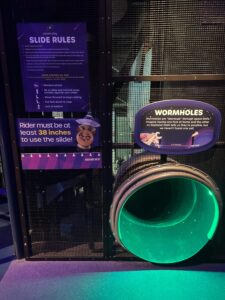 Let’s keep moving towards the back of the KSC - Space Shuttle Atlantis! The mission zone has two activities that you do need to be 38in to do. The first activity is crawling through a replica of the International Space Station. This is suspended on the second level ceiling. You won’t want to miss the clear tube that gives you a fantastic view.