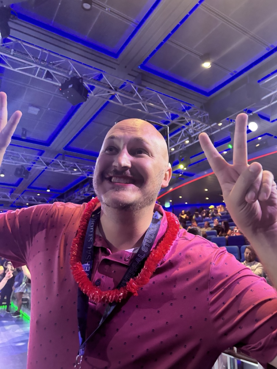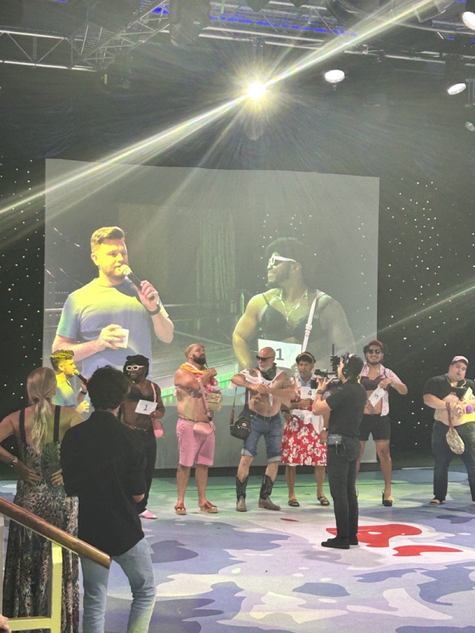 Here’s how it works. The Quest takes place in the Studio B ice rink because it’s as close to a theater-in-the-round space they have on board. Everyone is a participant! Guests can sit anywhere they want but if you have traveled with friends or family, make sure you save seats to all sit together. As the show begins, each section of the ice rink is divided into large teams. And I mean large! You will not just be playing with your friends or family, you’ll be playing with other cruise guests – upwards of 100 people sometimes.