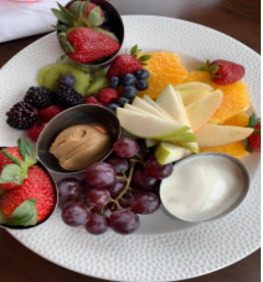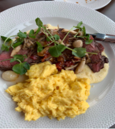 Our meals were 100% fantastic! My husband had the Spiced Sausage Hash with potatoes and a delicious poached egg on top. Our picky five-year-old enjoyed a humongous fruit plate with honey yogurt and a variety of fruit. And I was spoiled with starting my morning with their wood-fired butchers' steak. I mean, who doesn’t want to start the day with perfectly cooked and seasoned wood-fired steak, polenta, and wild mushrooms?!