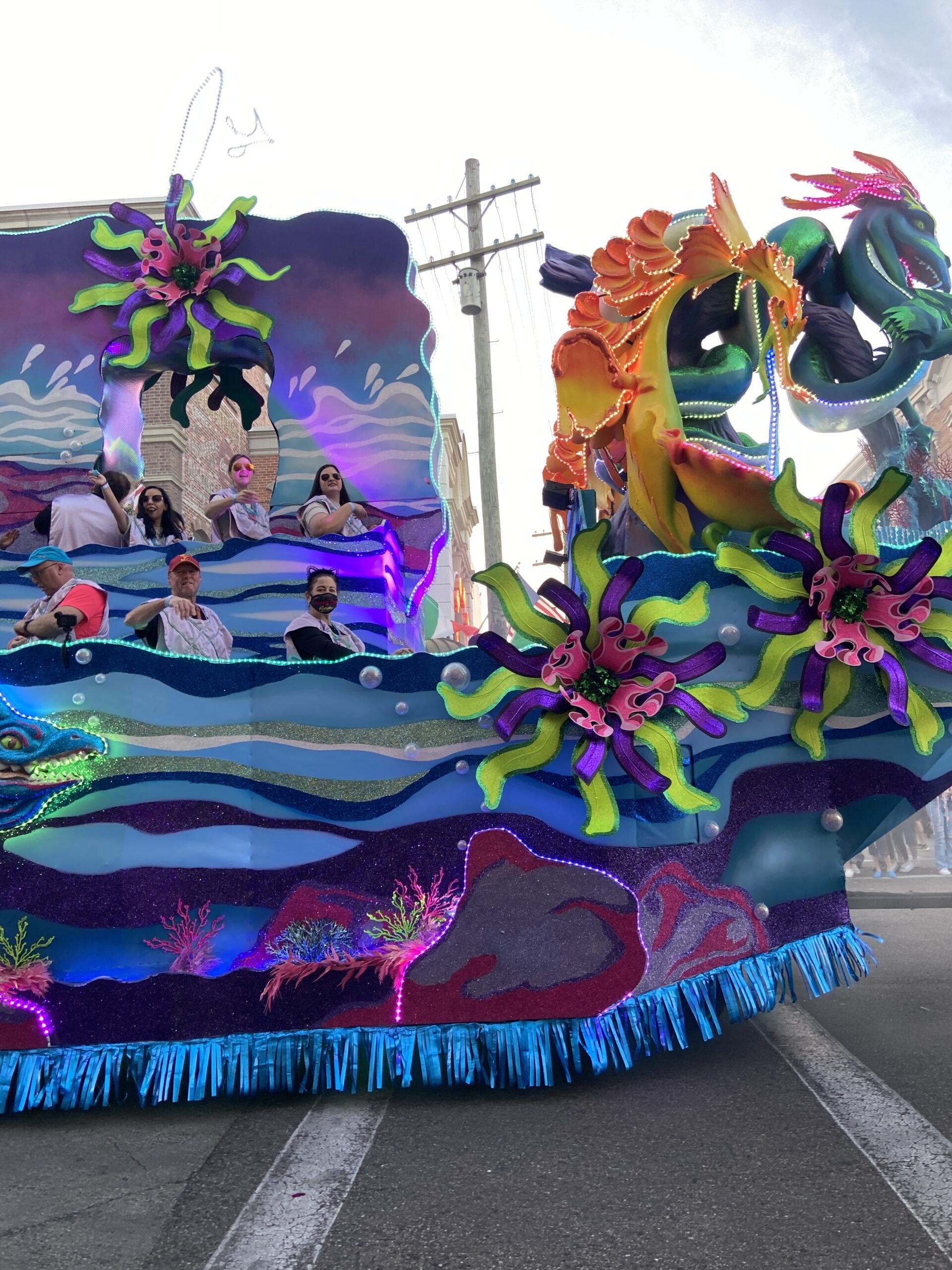 The parade features dancers, stilt walkers and 12 floats. Six of the floats remain the same from year to year and the six floats in the middle change based on the theme for the year. The 2023 theme is based upon “mythical creatures”.