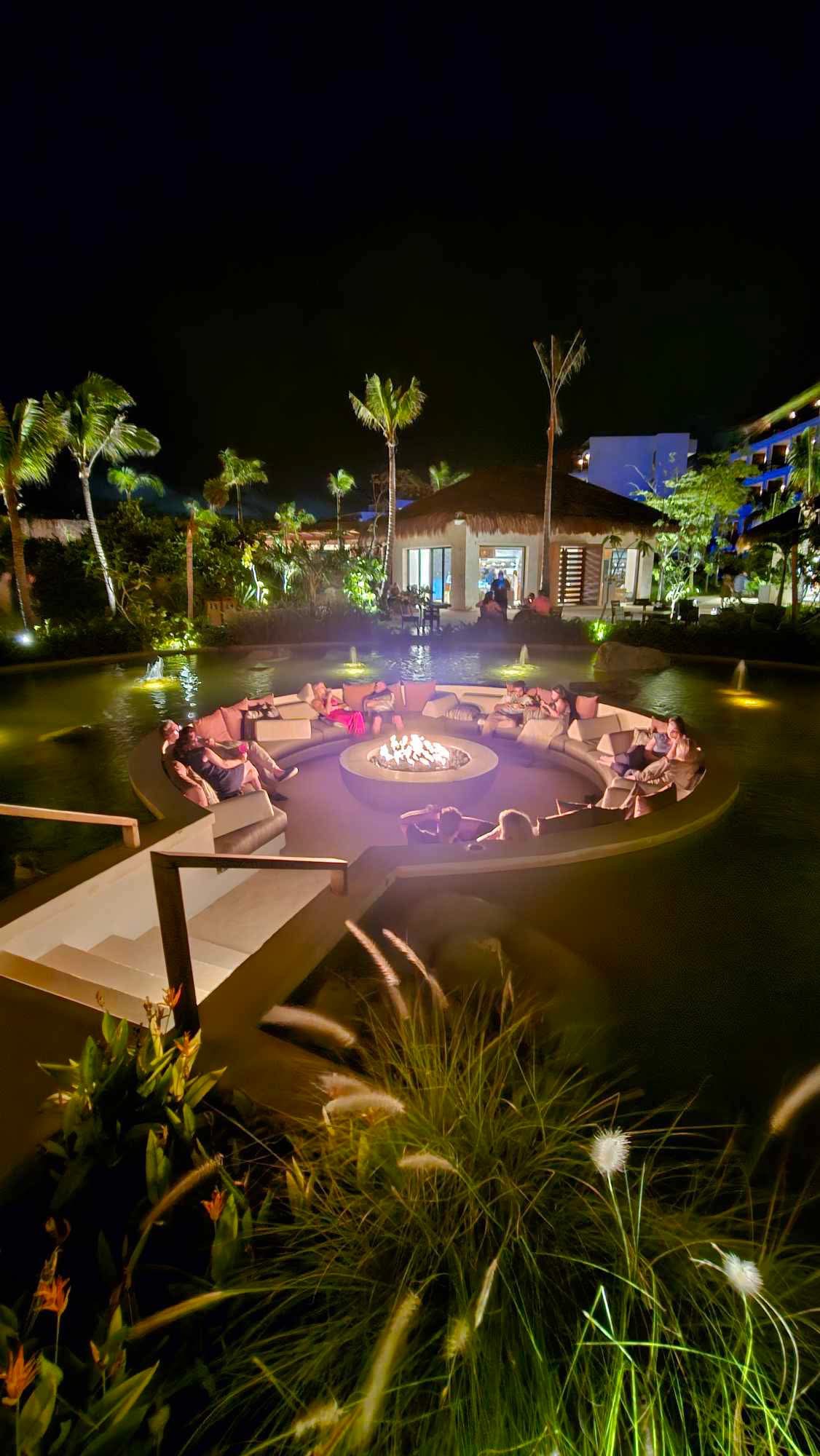 By day, it’s airy and fresh with earthy macramé décor and plenty of seating. By night, it transforms into a magical space with a glowing blue pool, music from the lobby bar, the sound of waves crashing, and outdoor fireplaces surrounded by swaying palms.